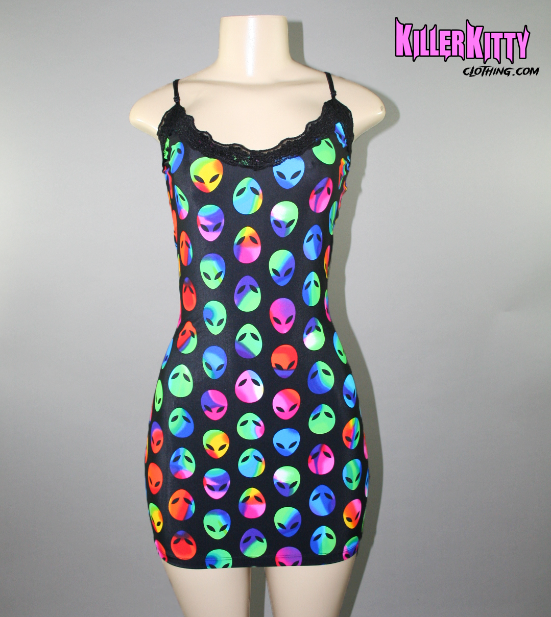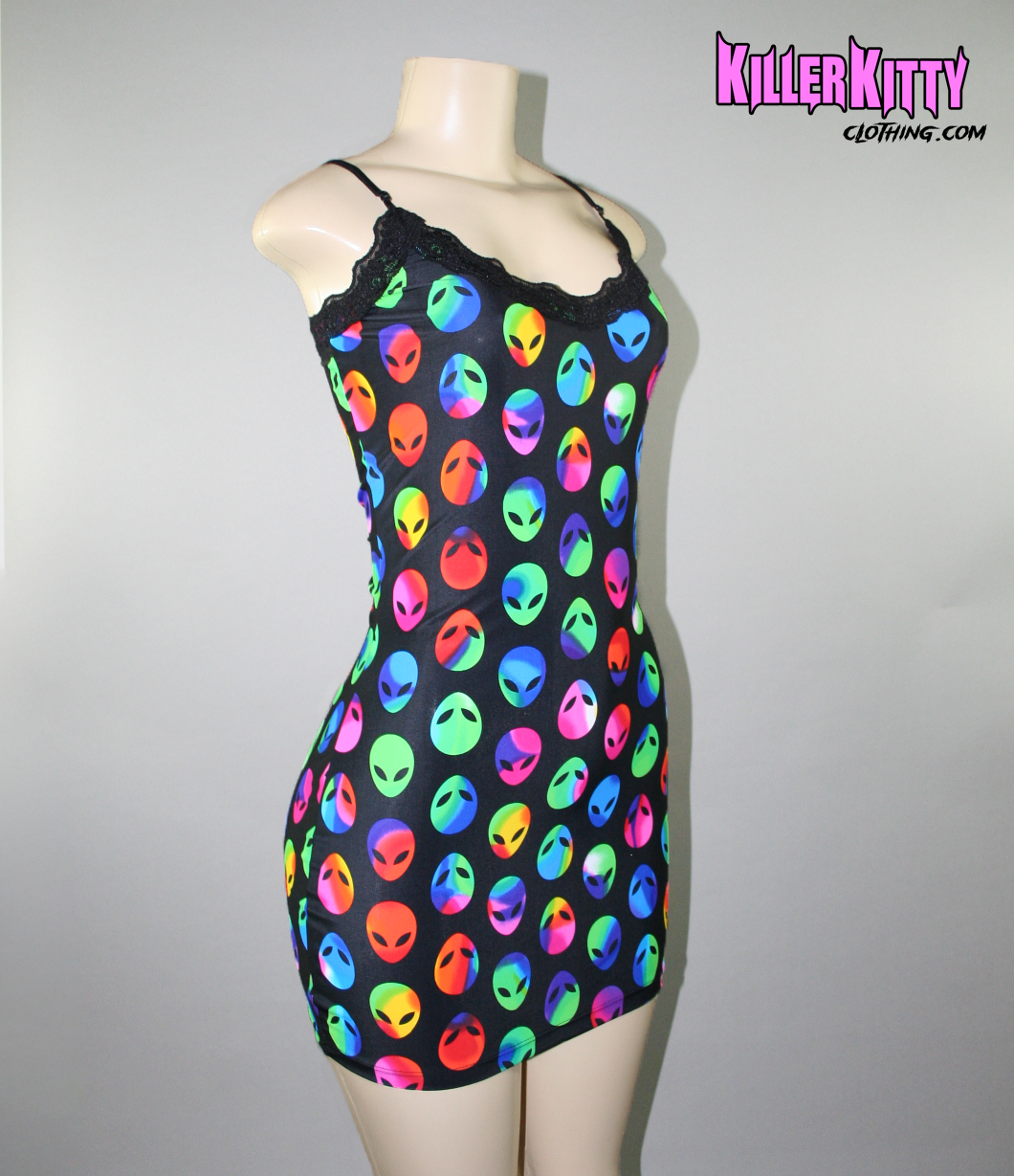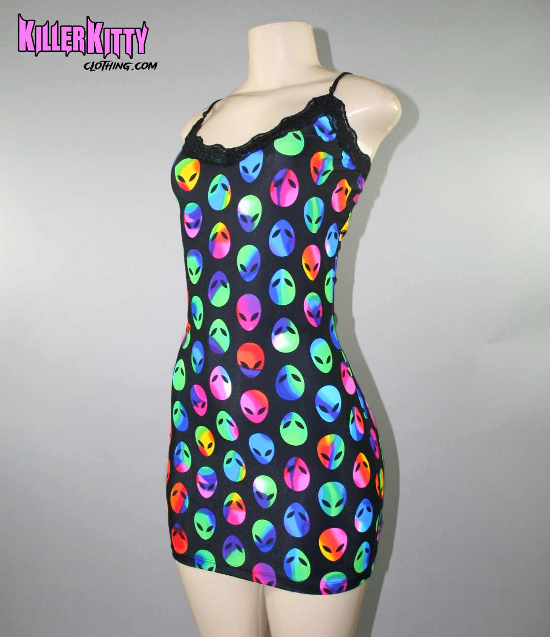 This dress has a flattering fit and fun alien print, perfect for all alien lovers! The v-neck is trimmed with black lace and features adjustable bra straps for extra comfort.