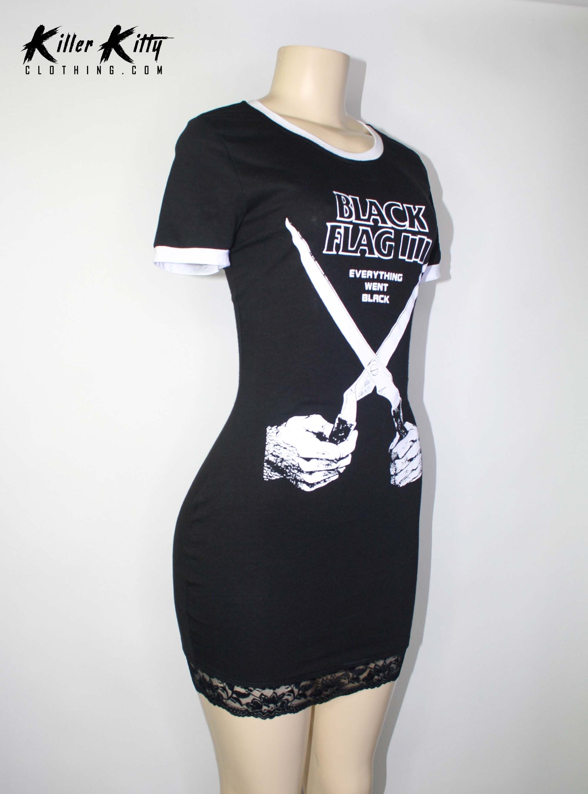 Altered from a t-shirt for a flattering fit with white knit trim on the neck and arms with black lace on the hem.
