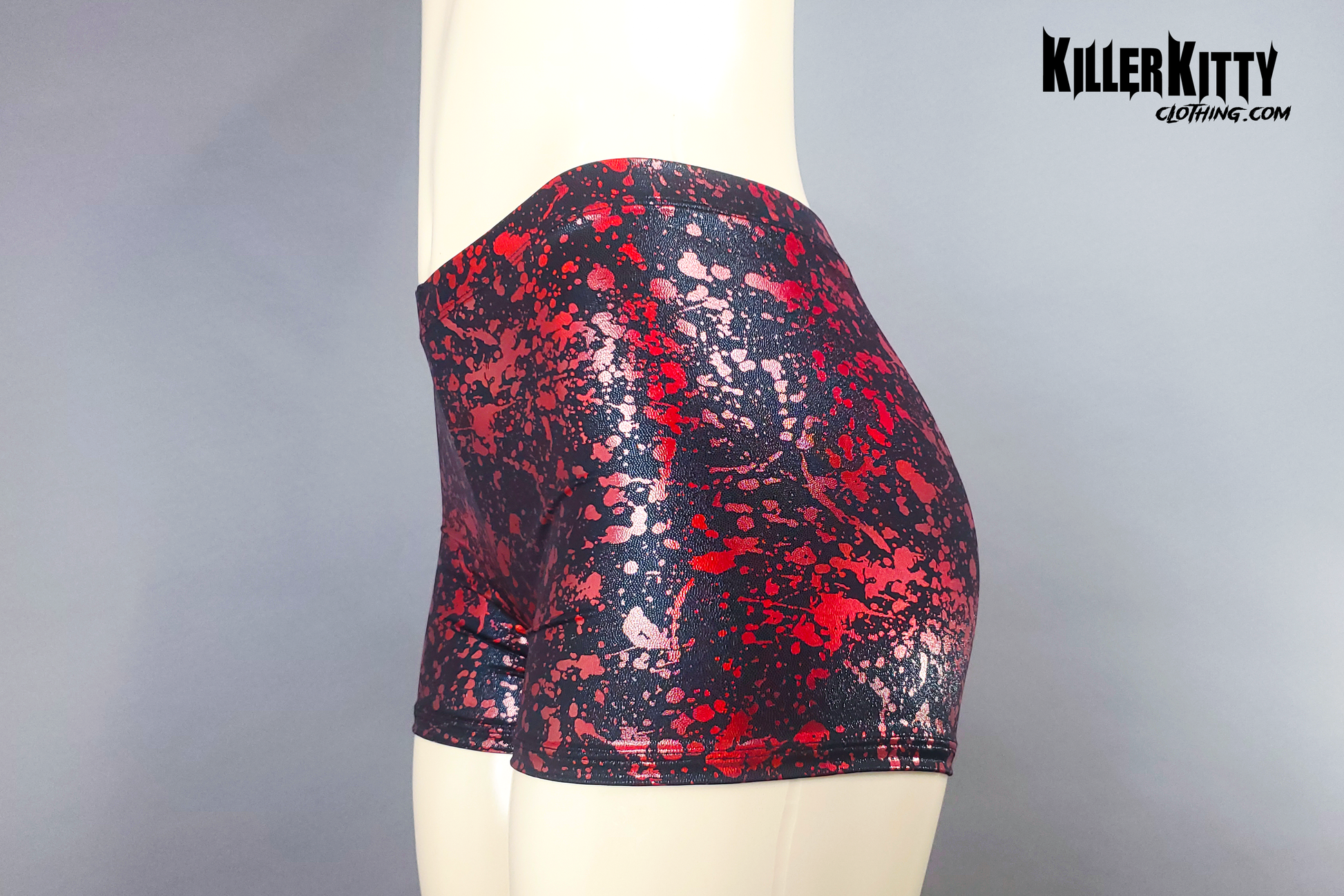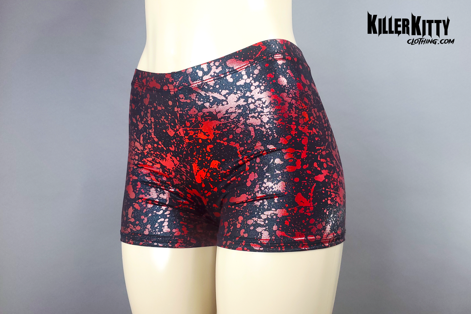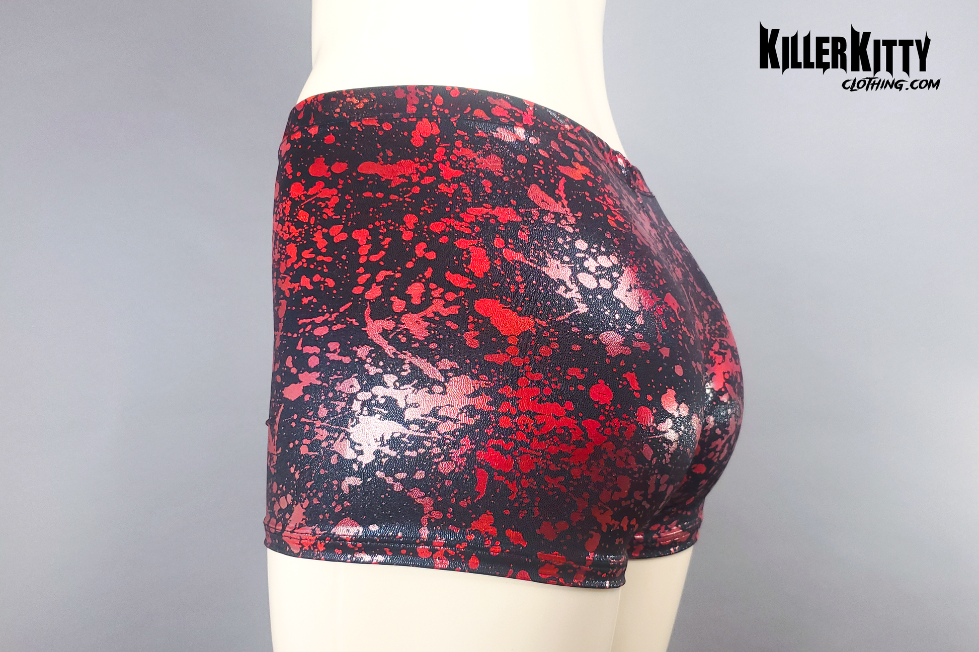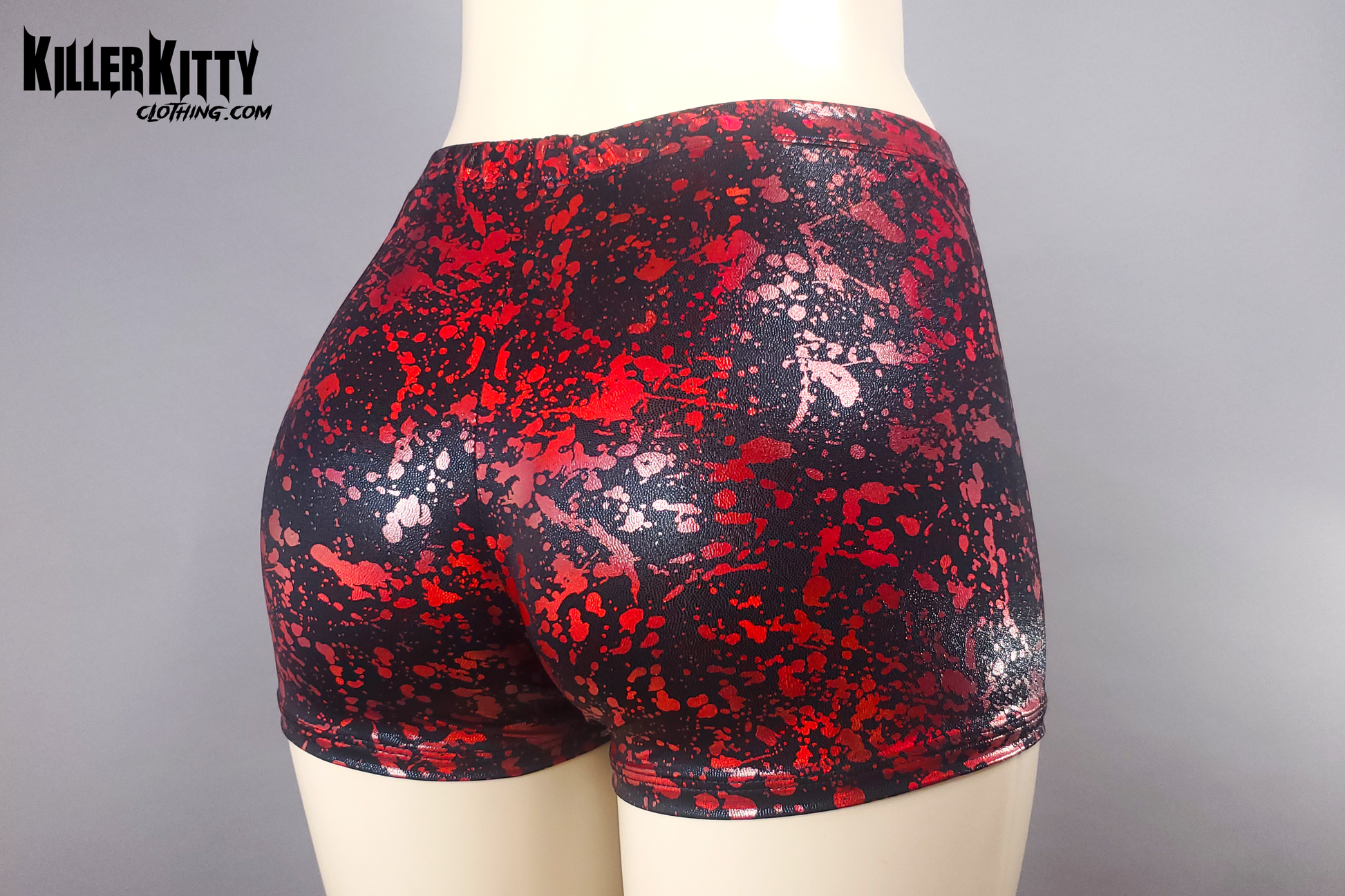 Metallic Blood Splatter booty shorts. Elastic waist and coverstitch on legs.