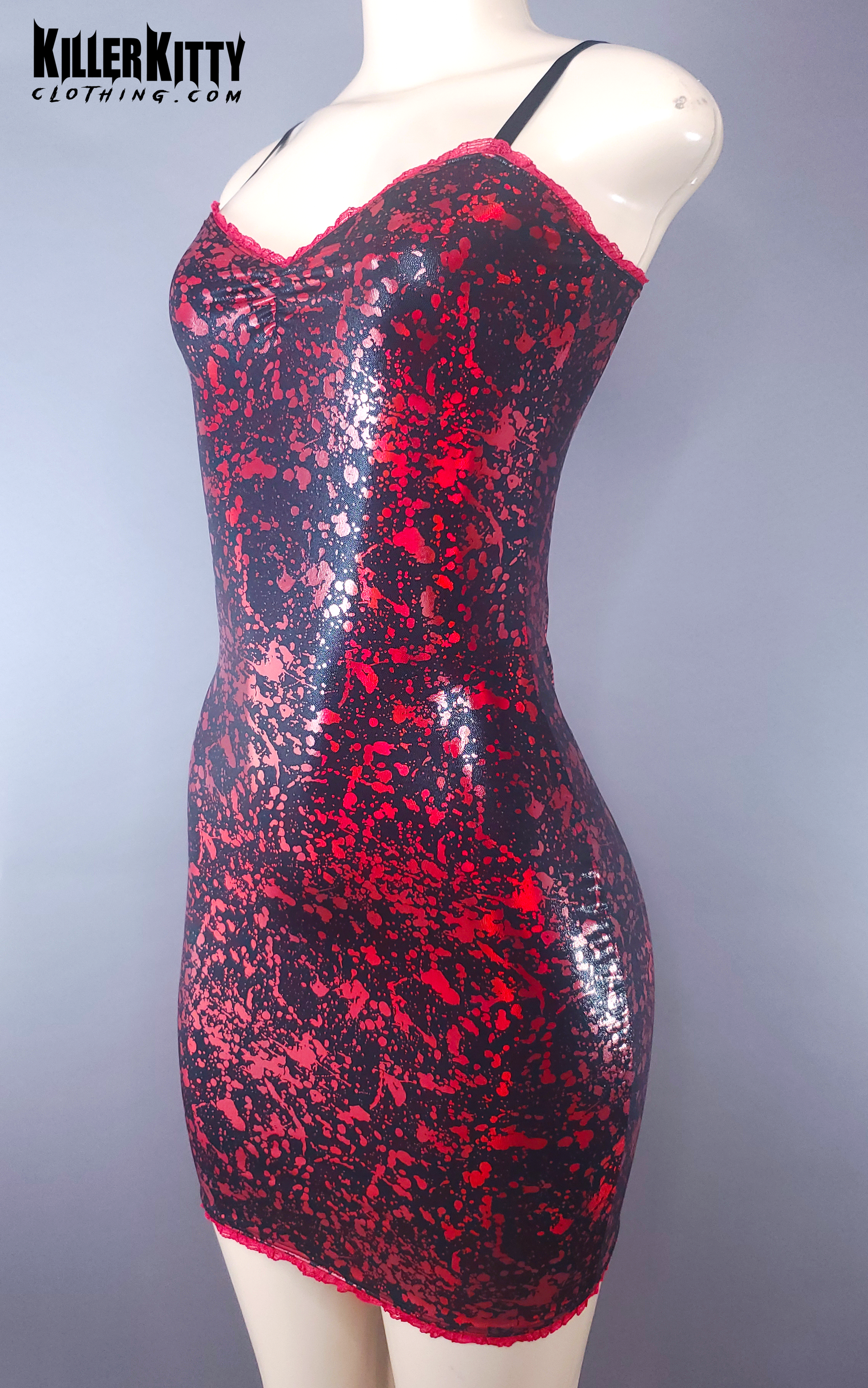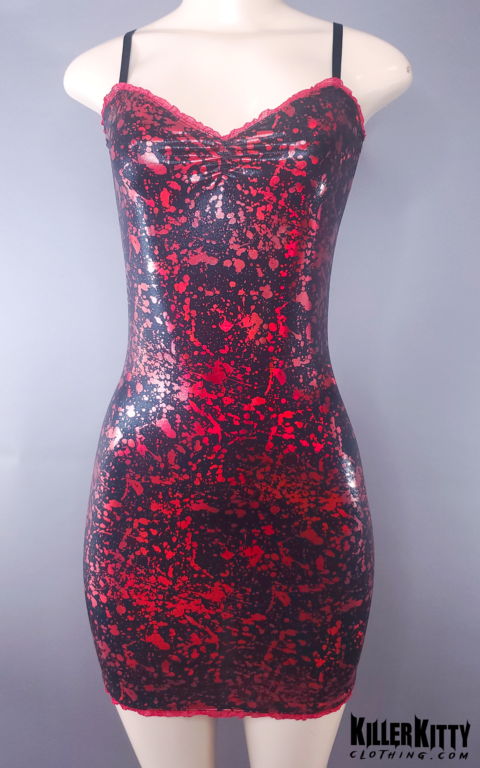 Blood splatter metallic print dress. Red mesh ruffle detailing on the