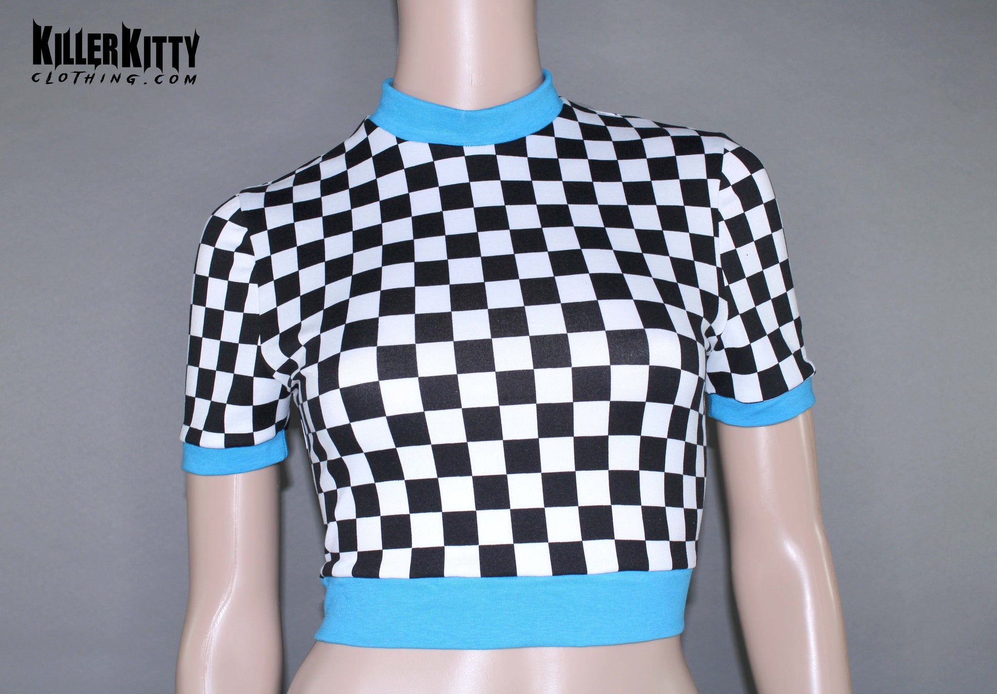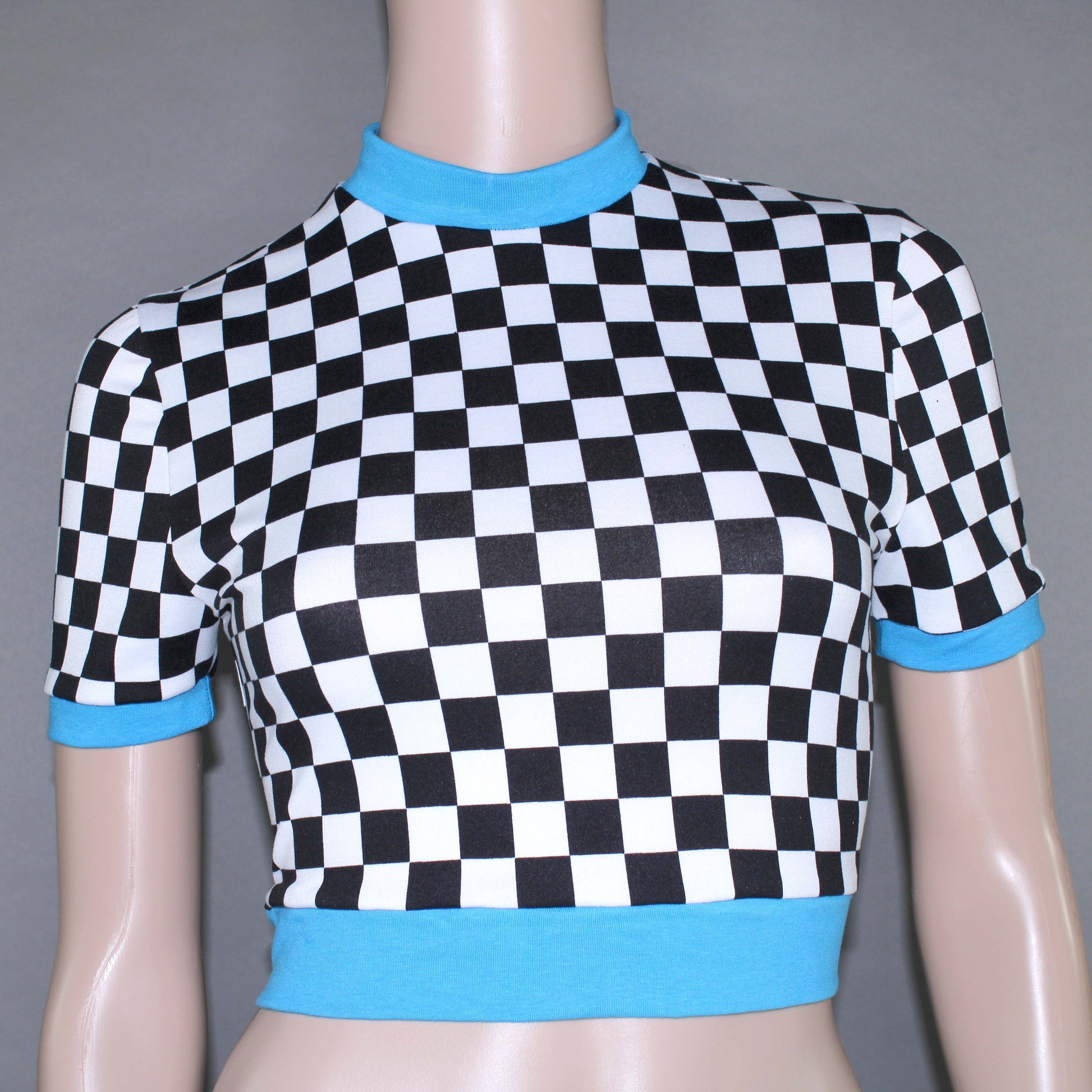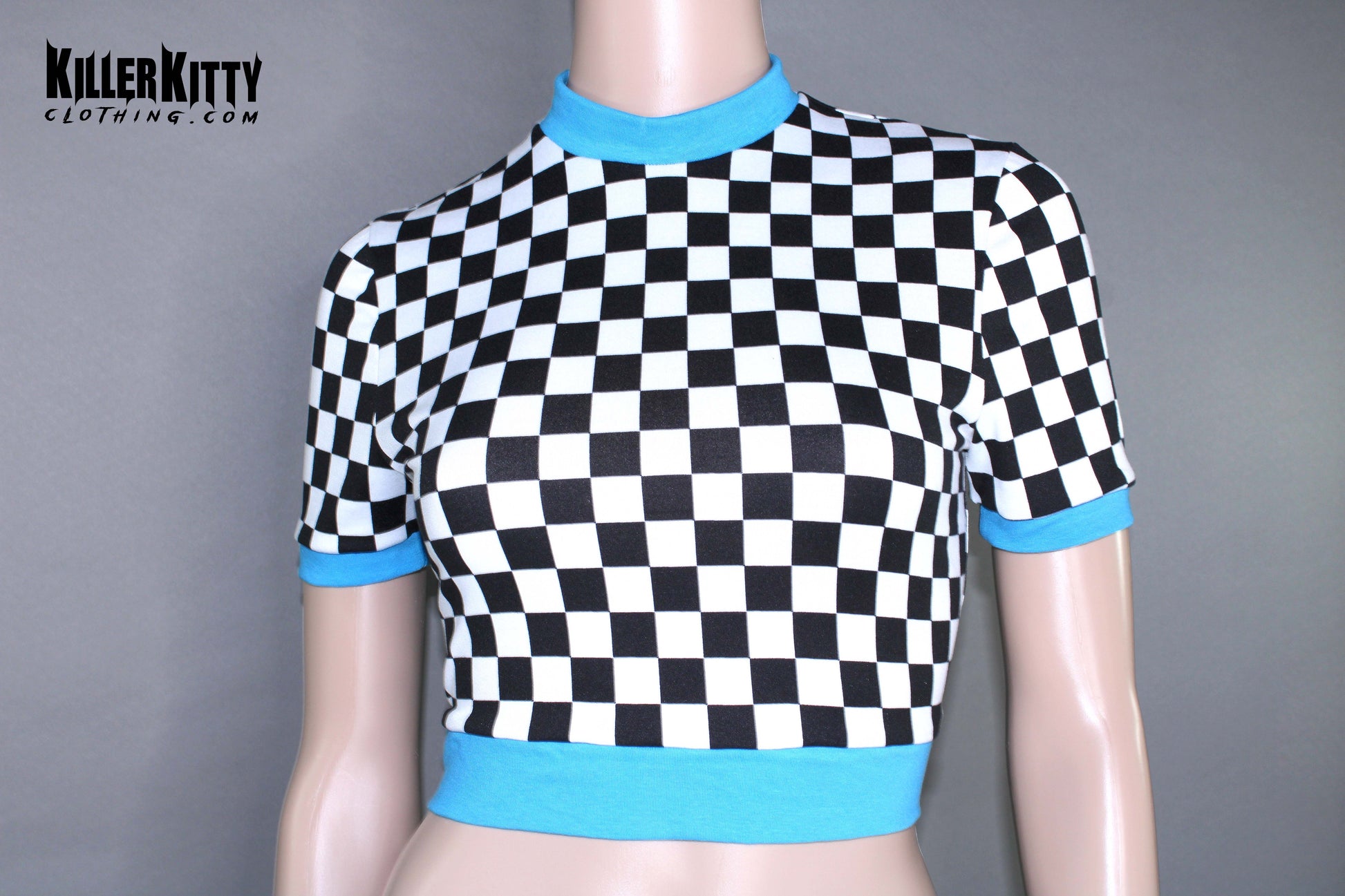 Checker crop top. Turquoise trim on neck, arms and waist.
