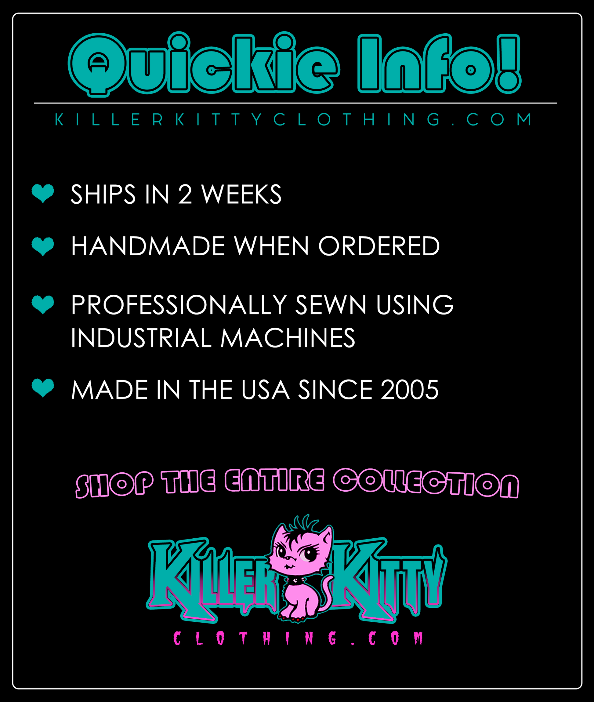 Altered from a t-shirt, this horror movie dress has a straight neck trimmed with blood red picot elastic, adjustable bra straps and black lace on the hem. Dress is 24" - 25" in length (armpit to hem).