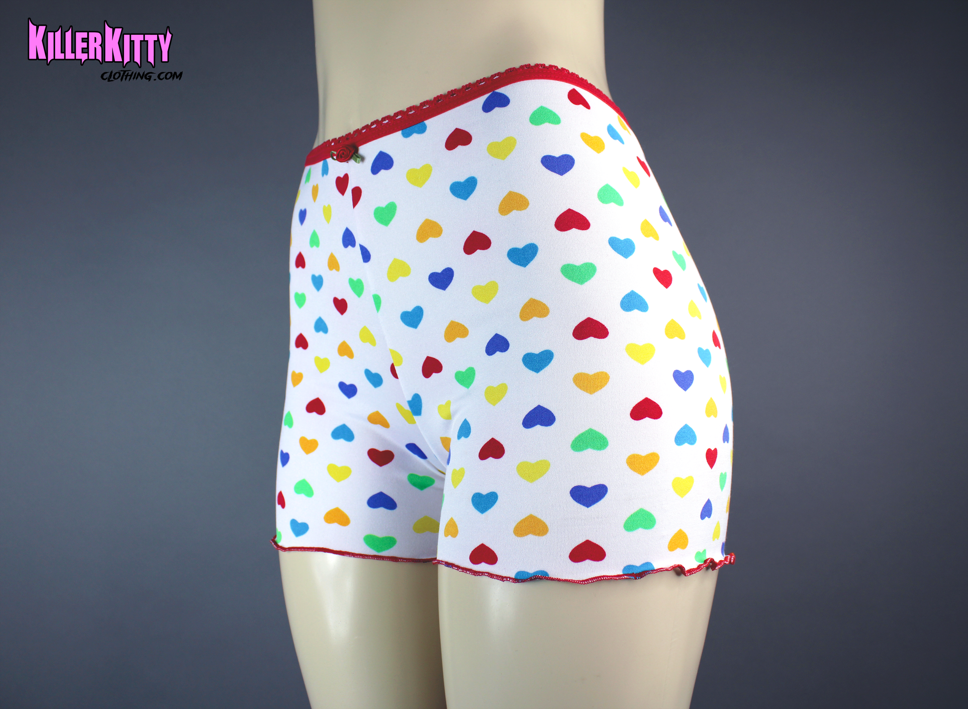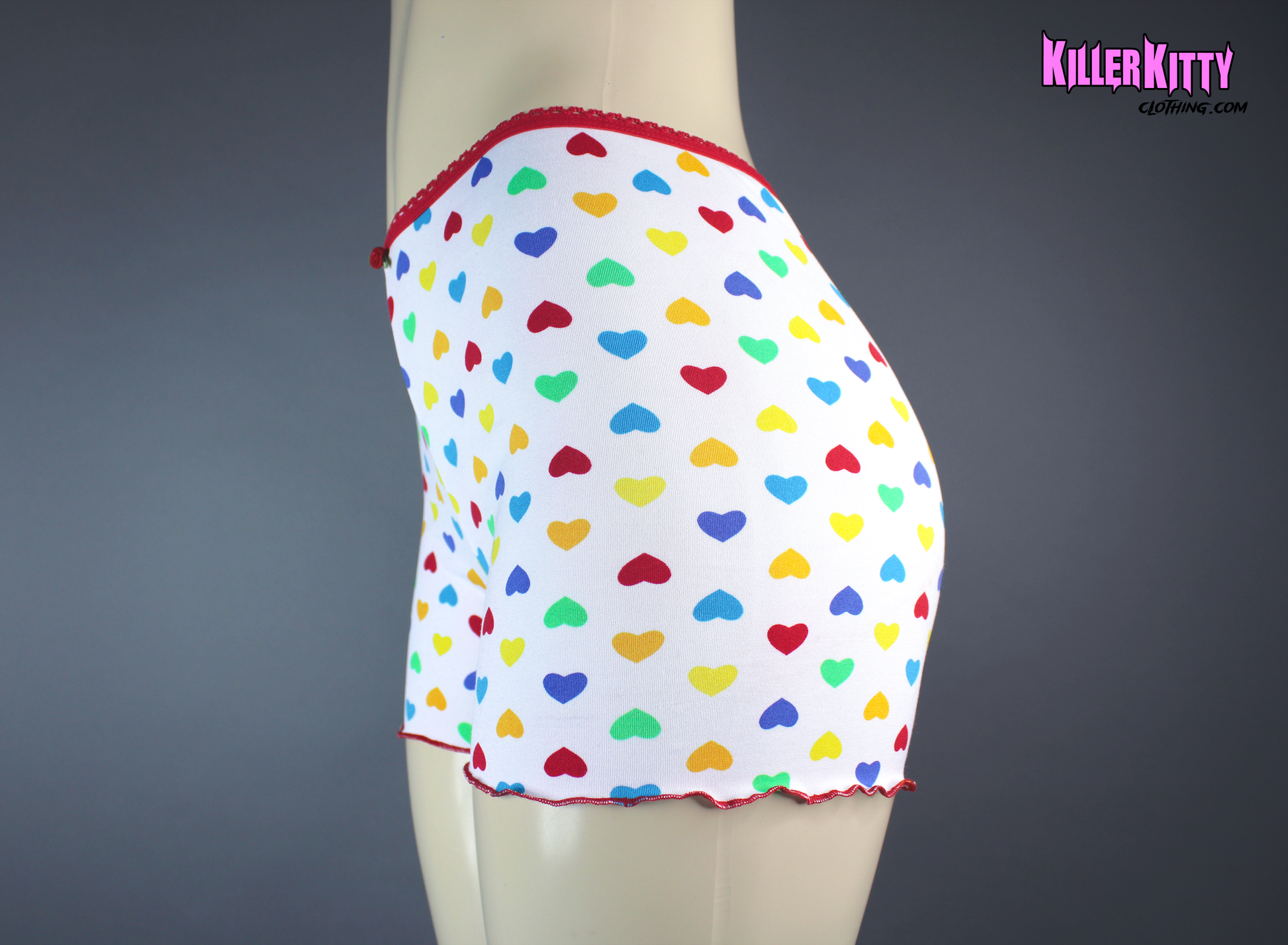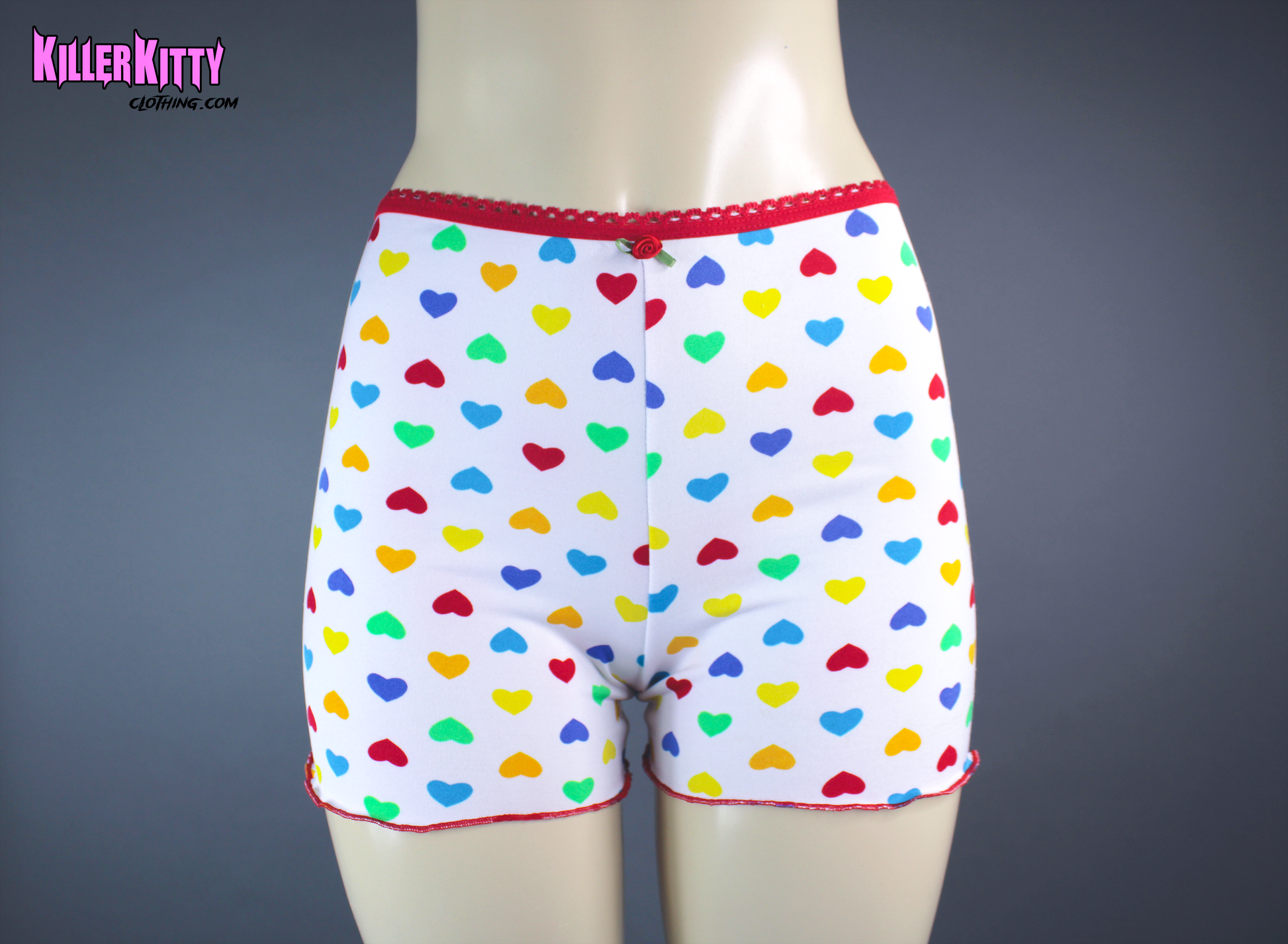 Limited, Custom-made heart lounge shorts. Red picot elastic trimming the waist and small flower detail. SLIGHT SCUFFING AND SNAGS ON BACK. CHECK PHOTOS.