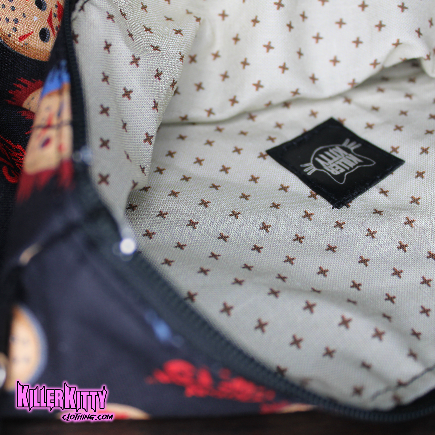 Handmade pouch / bag created using Friday the 13th, Jason Voorhees print. The bag is lined in cream print with a zipper closure and grommet strap.