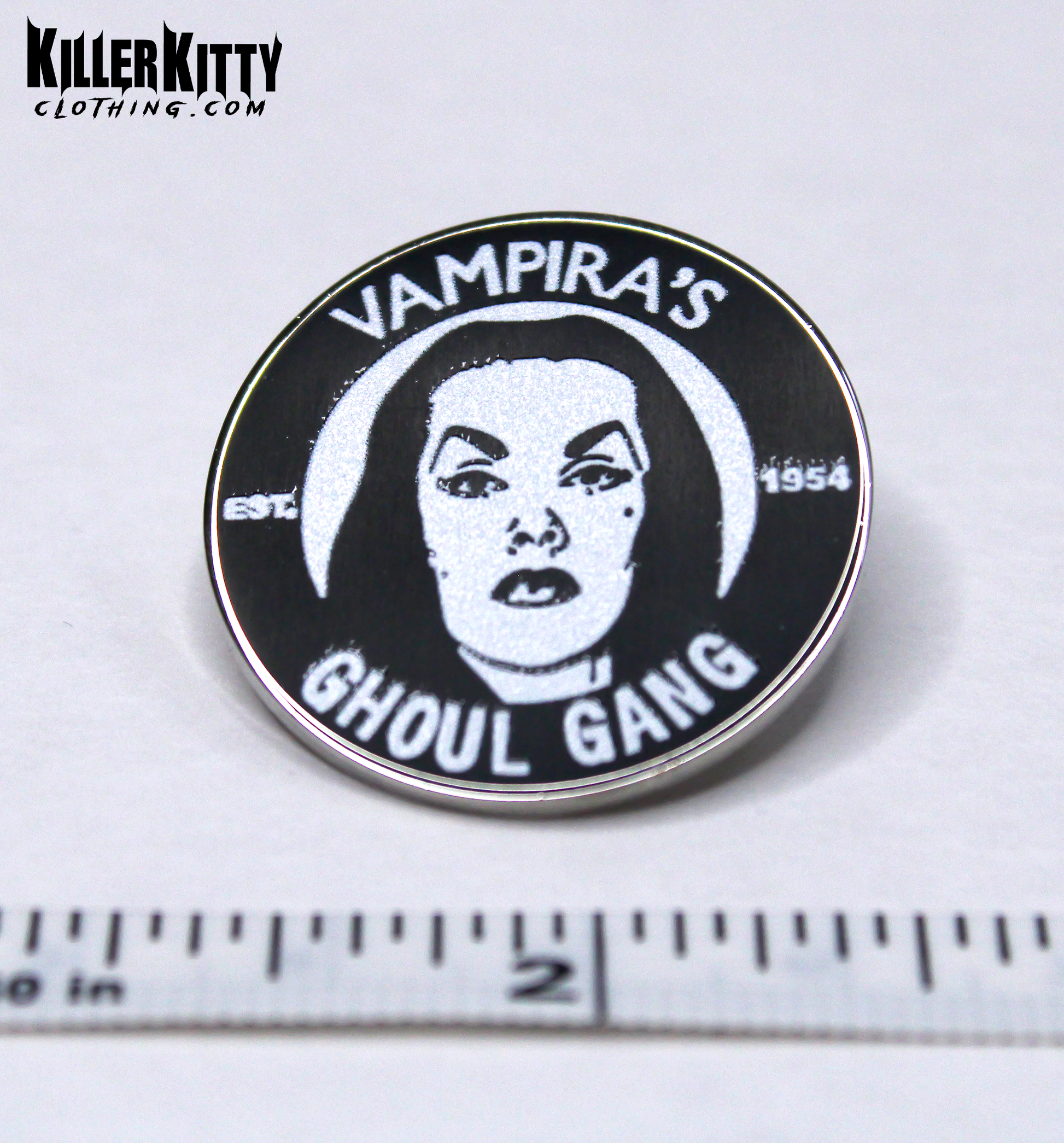 Accessorize your outfit with the goth queen of horror! This enamel horror pin has a single metal butterfly closure.