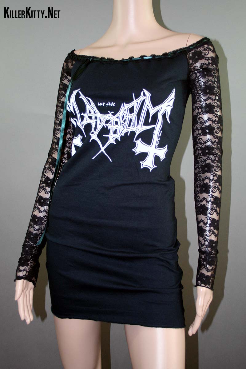 Altered from a t-shirt for a flattering fit with black lace, off shoulder, sleeves and black insertion lace trim on the shoulder with a black ribbon drawstring.