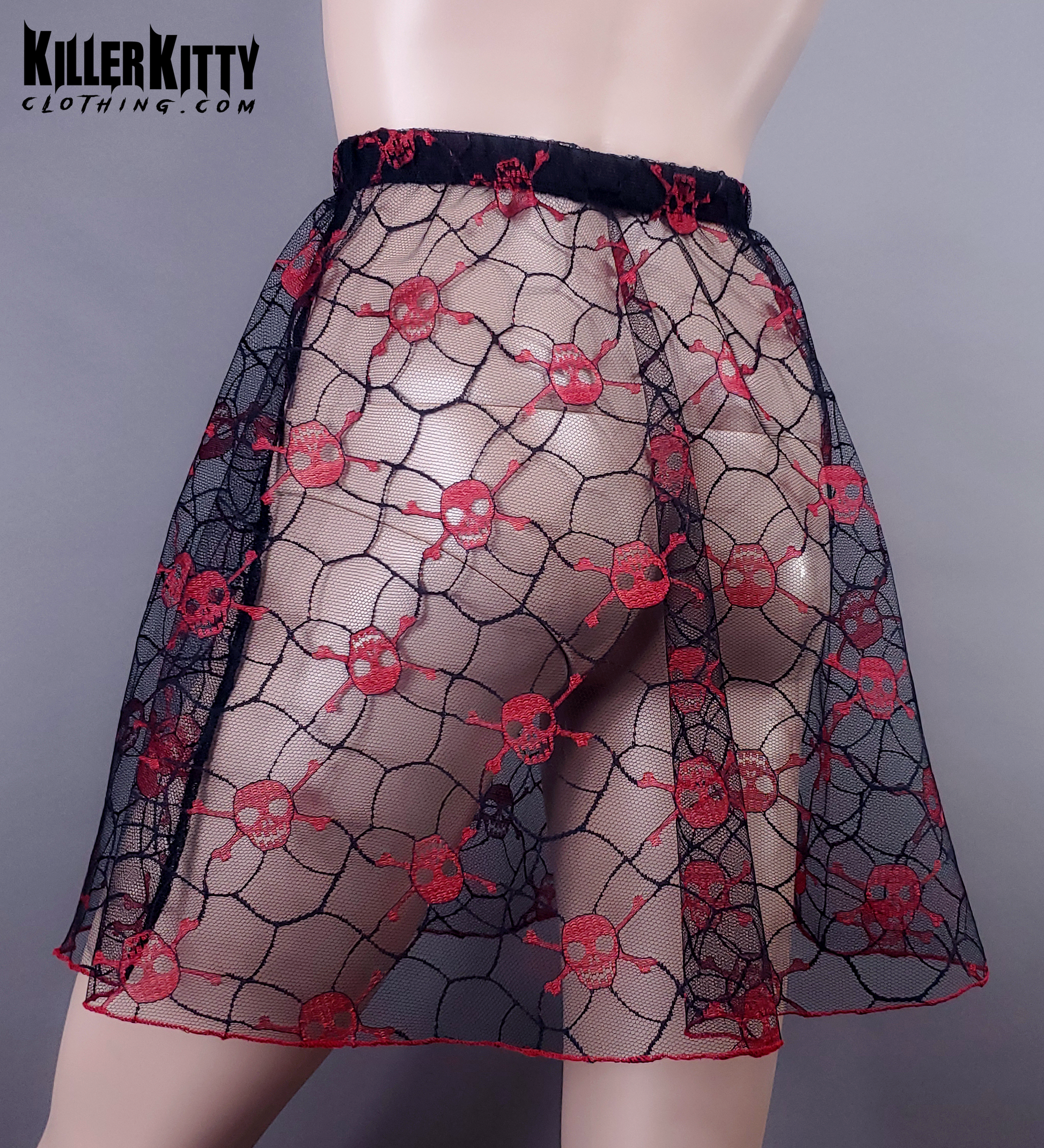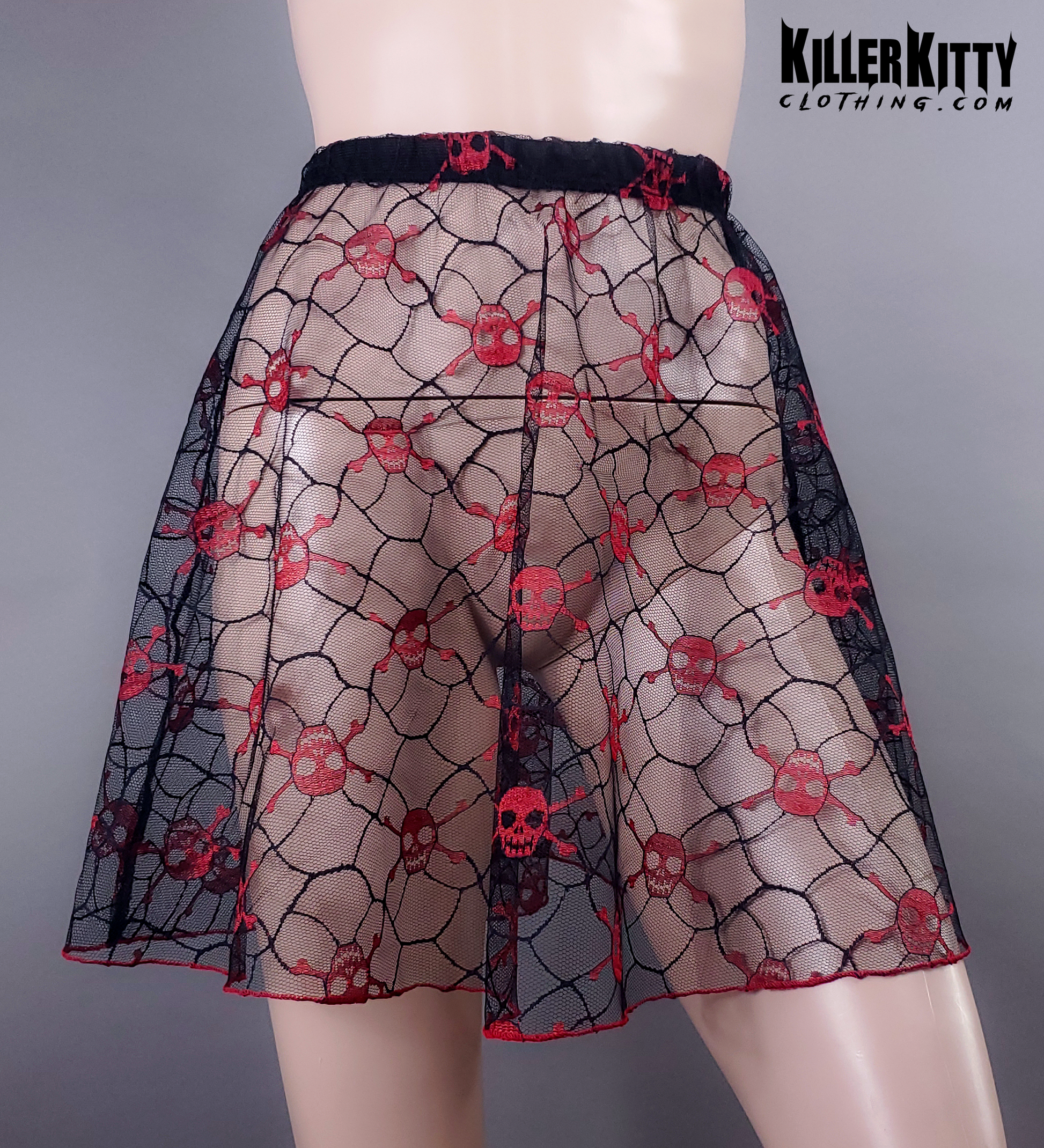 High waist Mesh Skull skirt. Elastic waist with red roll hem.
