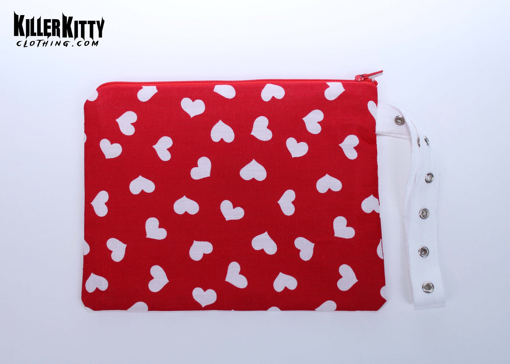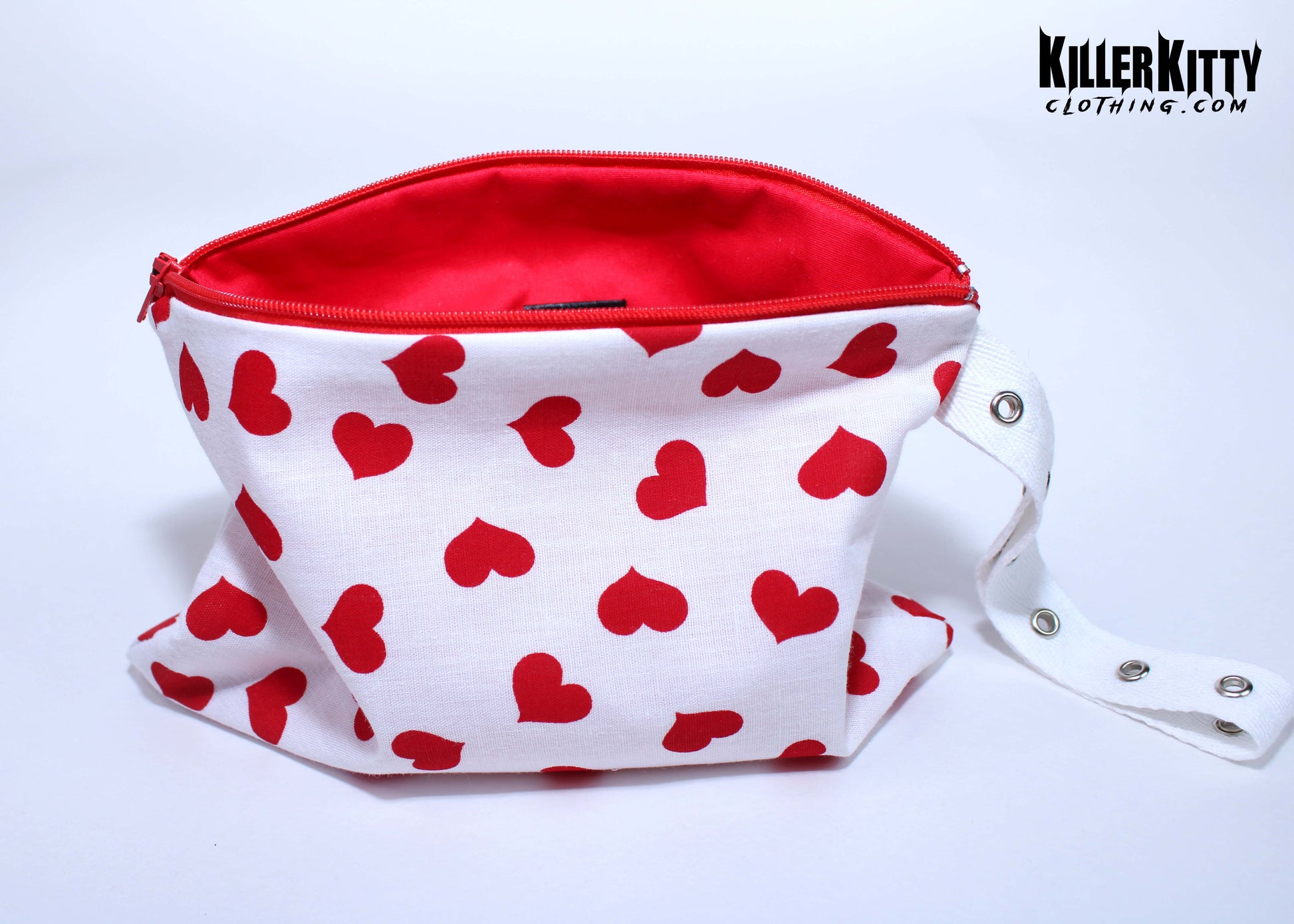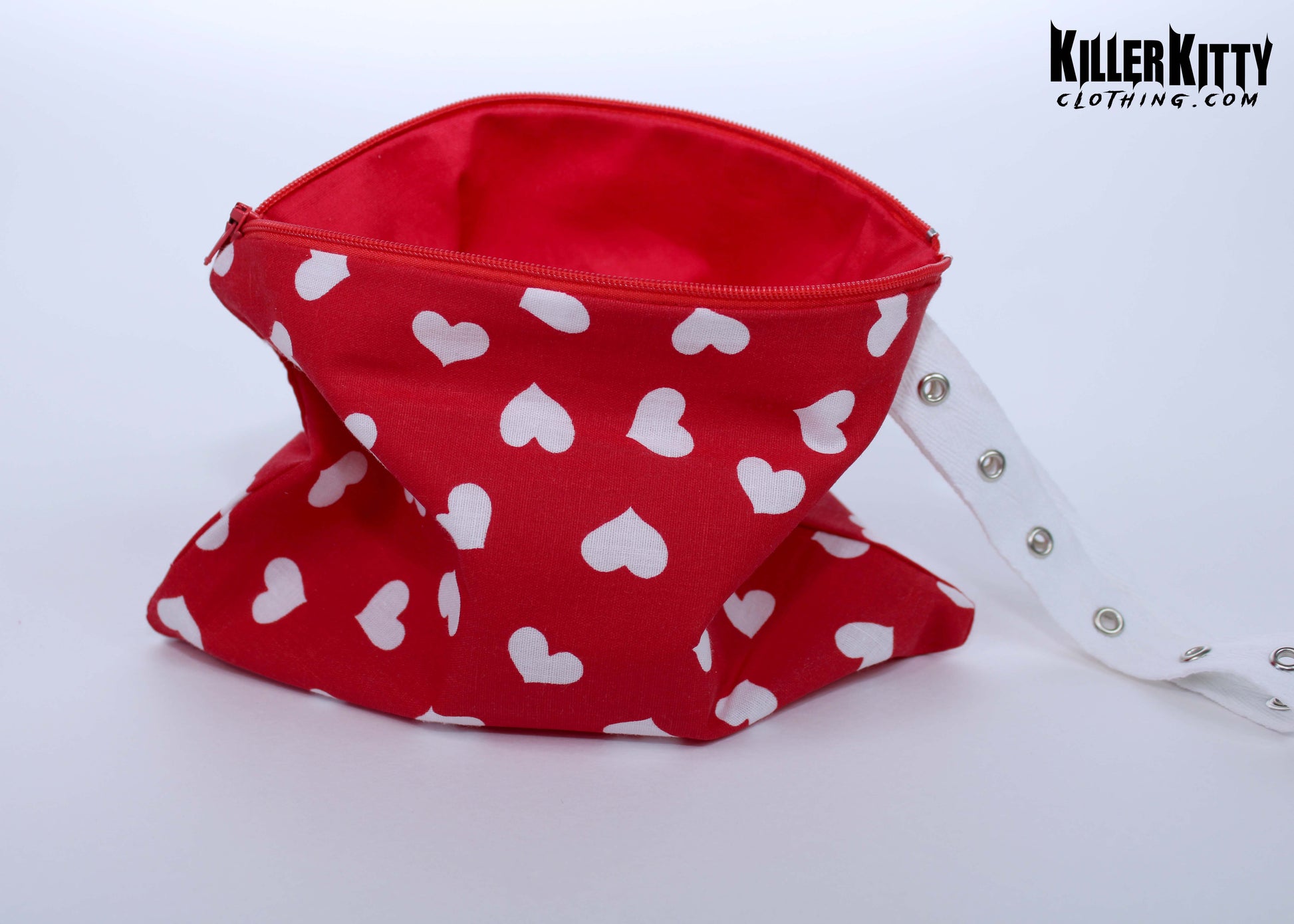 Mini heart print pouch / bag created using vintage 90s material. The bag is lined in solid red with a zipper closure and grommet strap.