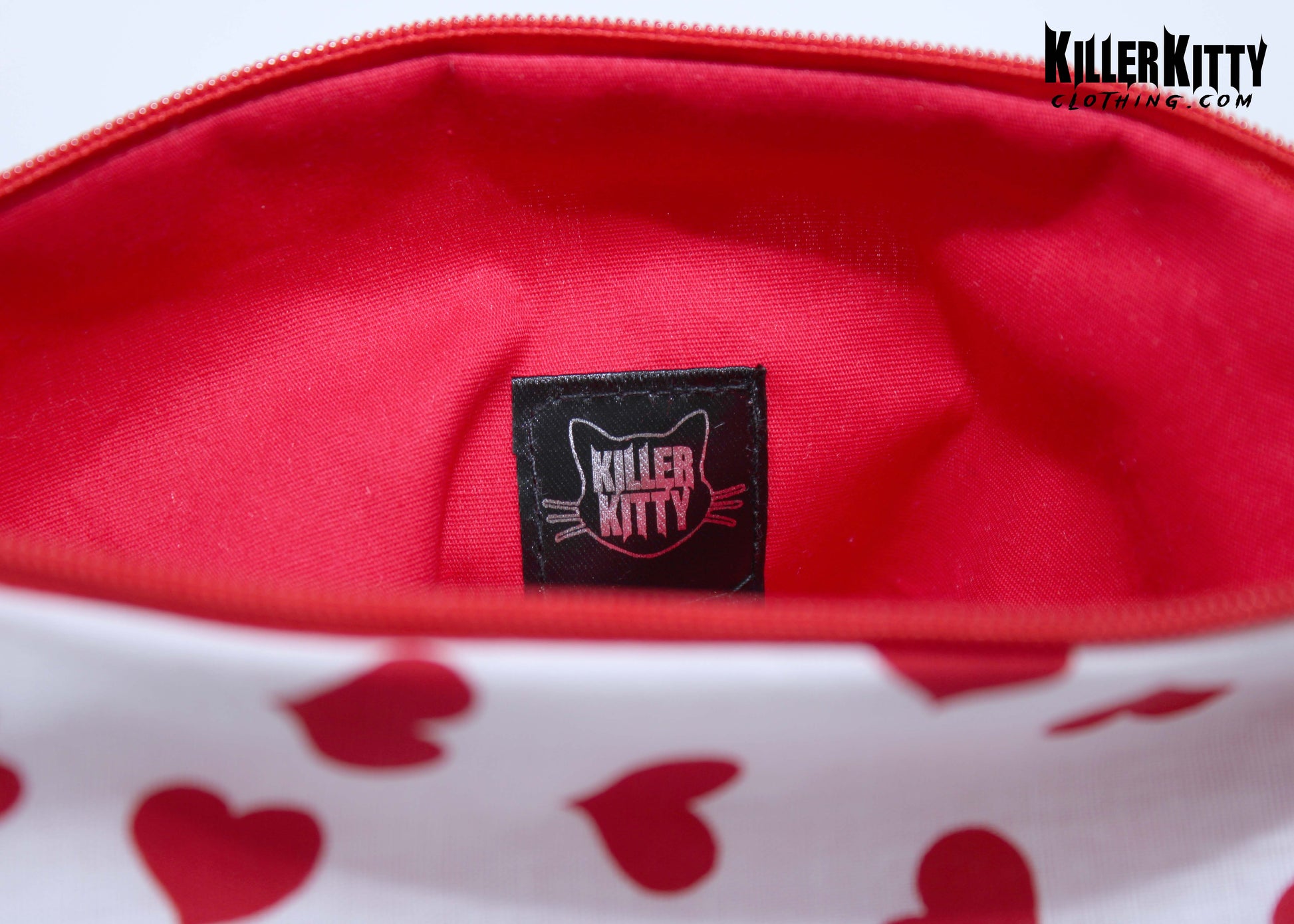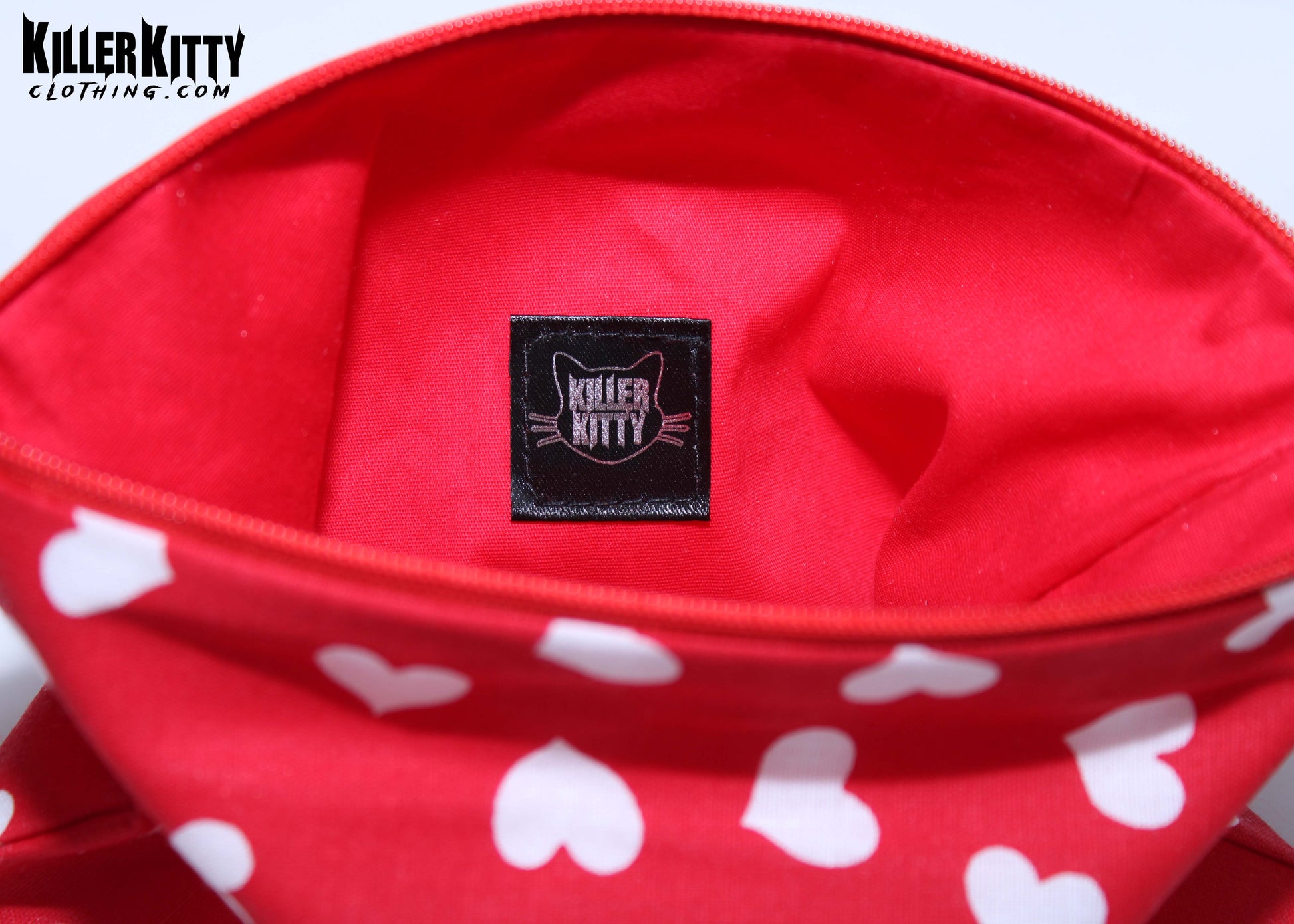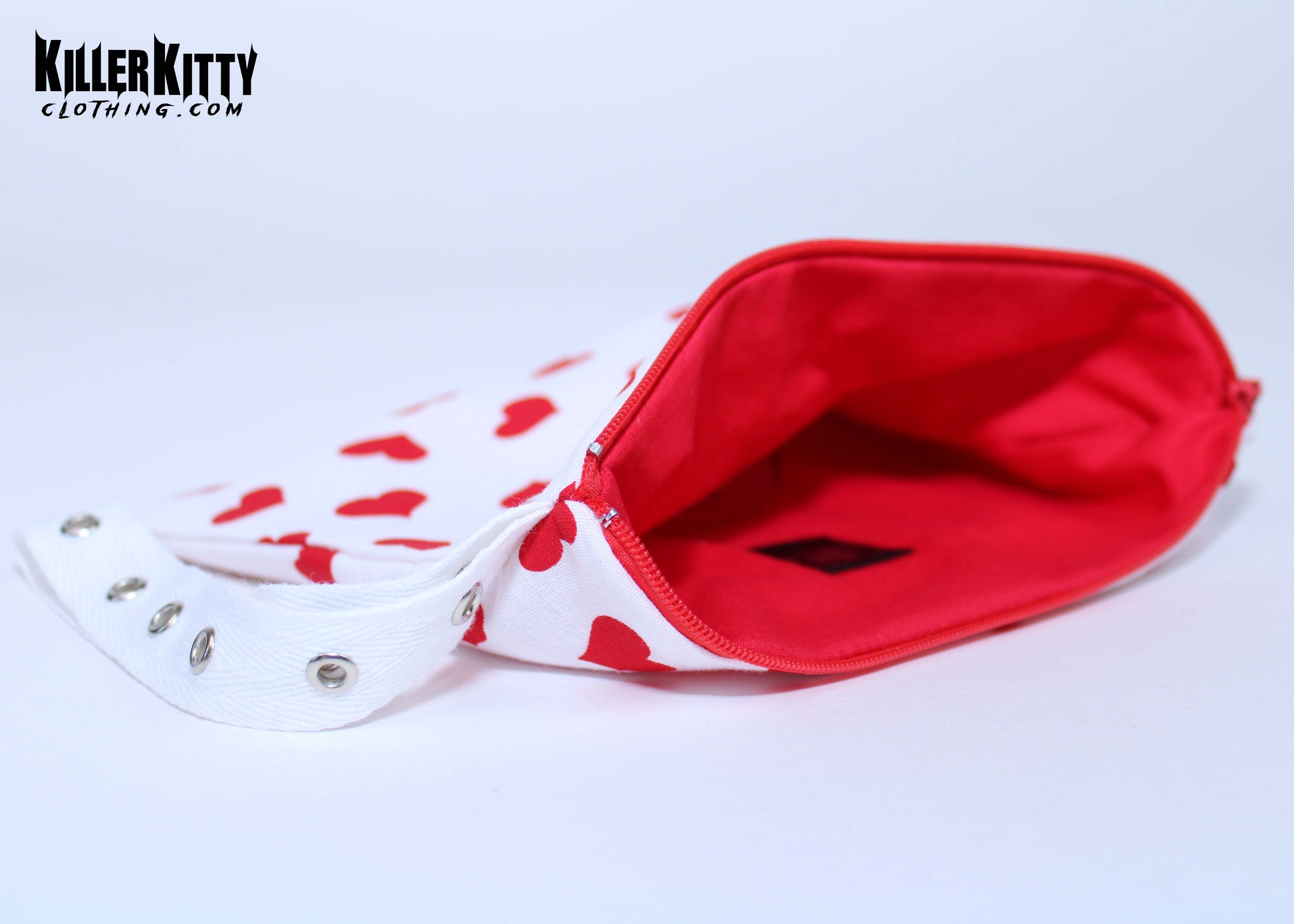 Mini heart print pouch / bag created using vintage 90s material. The bag is lined in solid red with a zipper closure and grommet strap.
