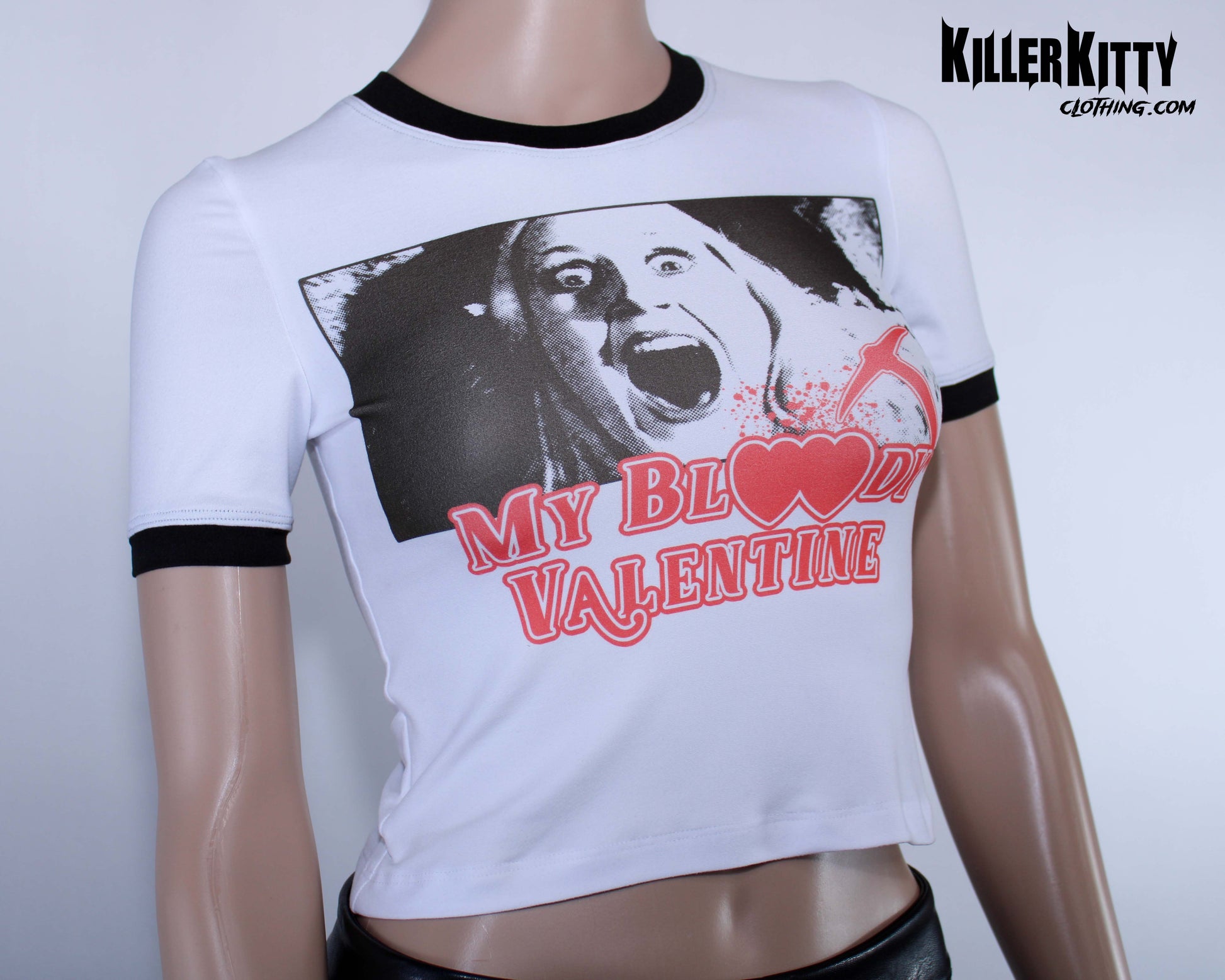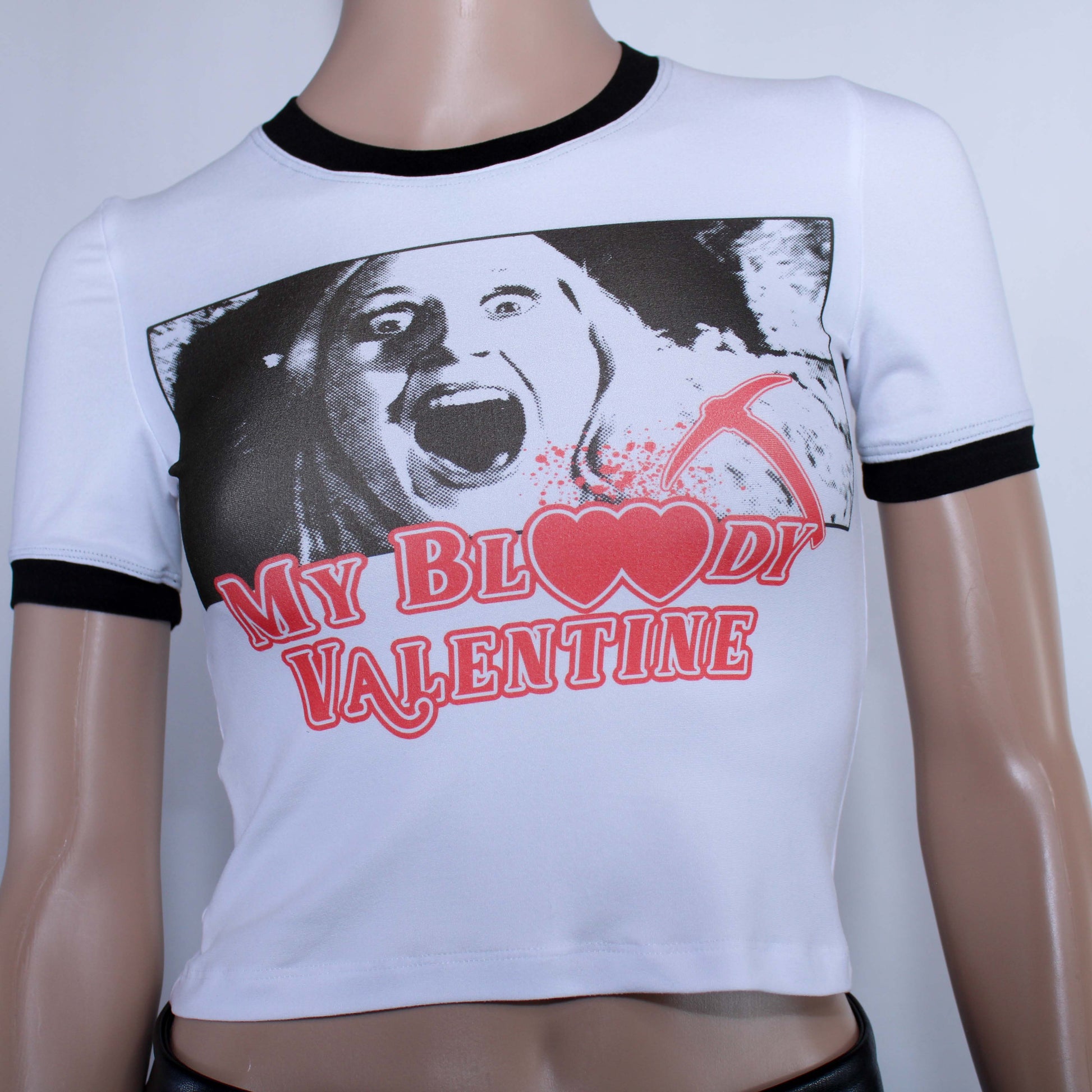 My Bloody Valentine white baby tee ringer. Black trim on neck and arms. Ultra soft, professionally hand-sewn shirt with hand-printed image.