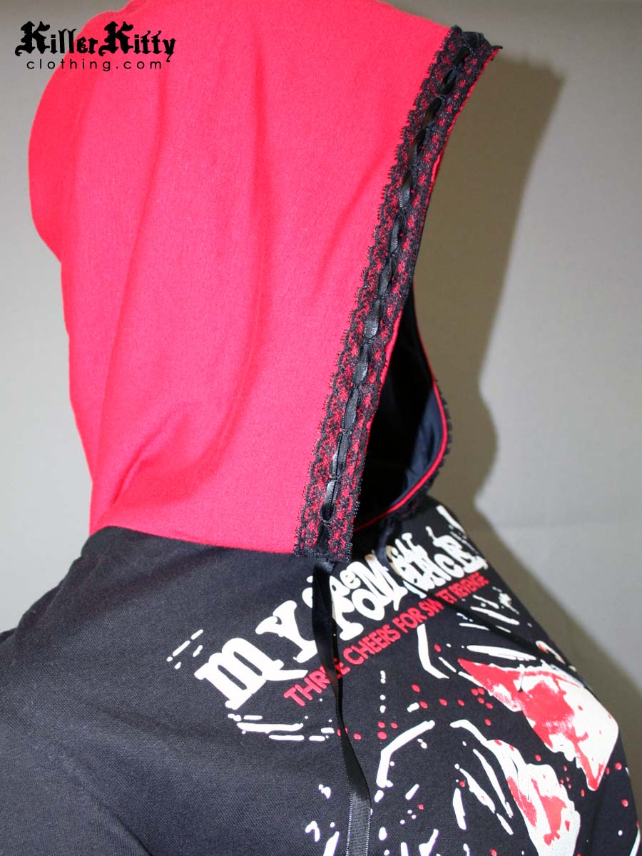 Altered from a t-shirt for a casual fit with red knit on the sleeves, hood and waistband. The hood is lined in black knit with lace trimming the edge and a black ribbon drawstring.