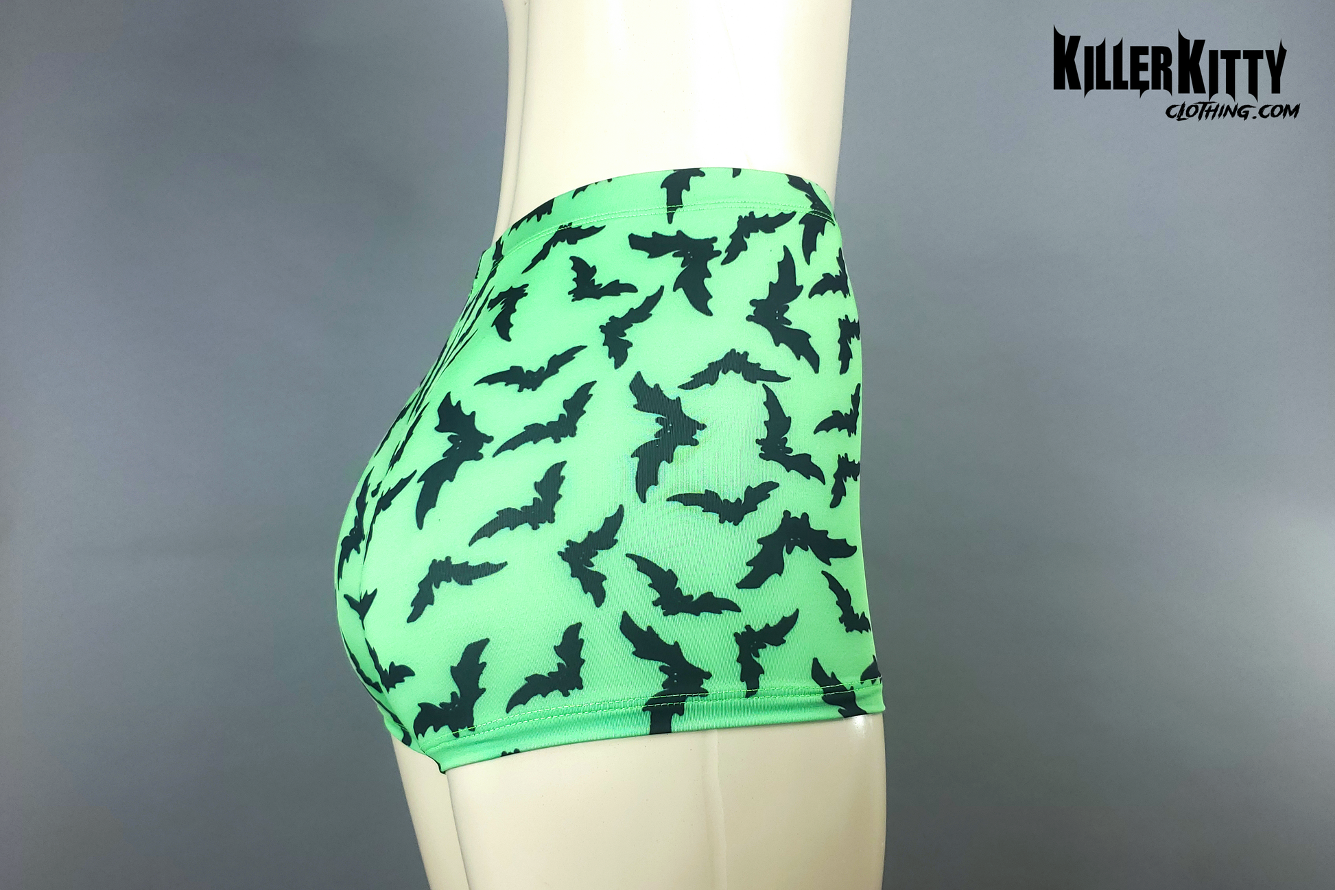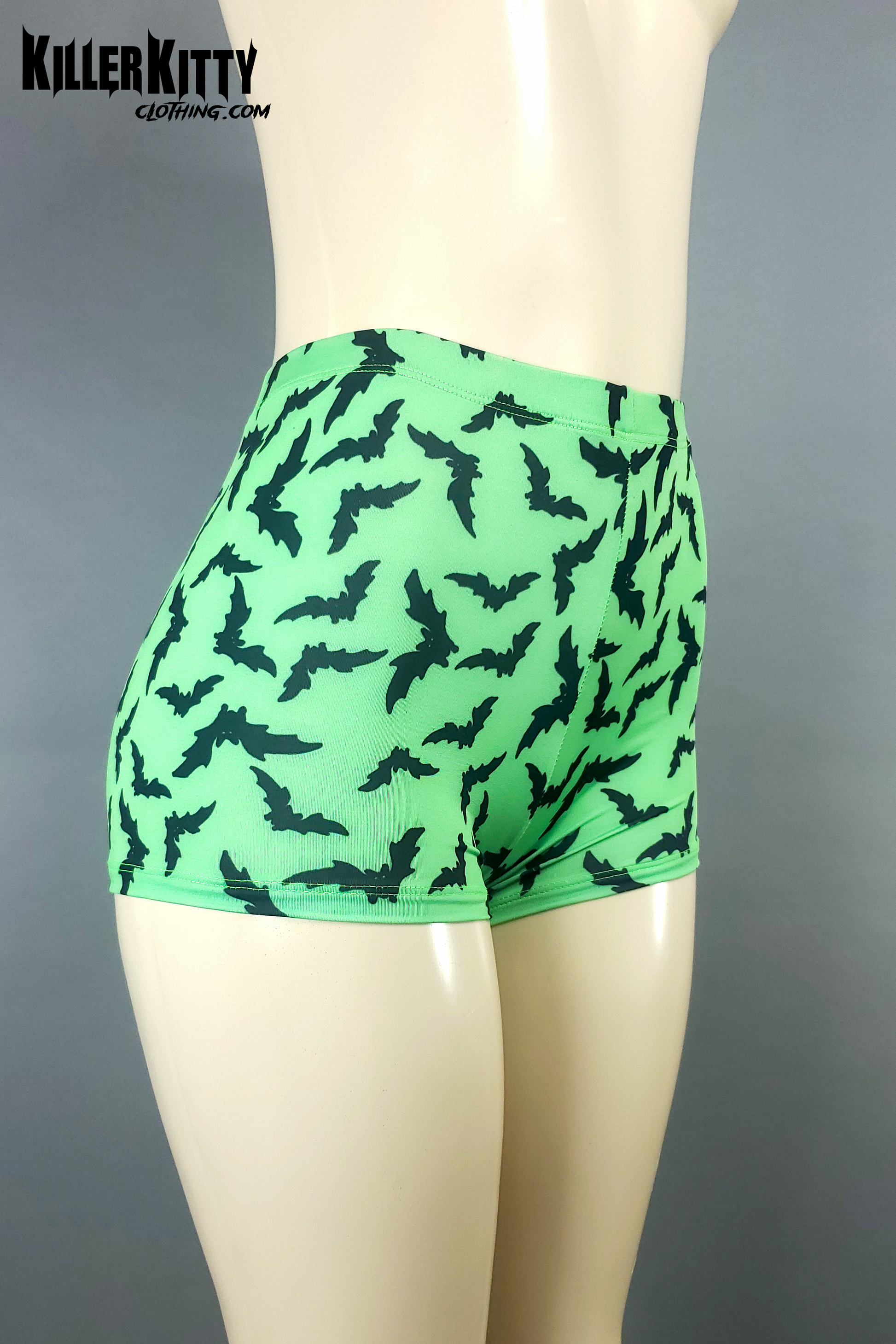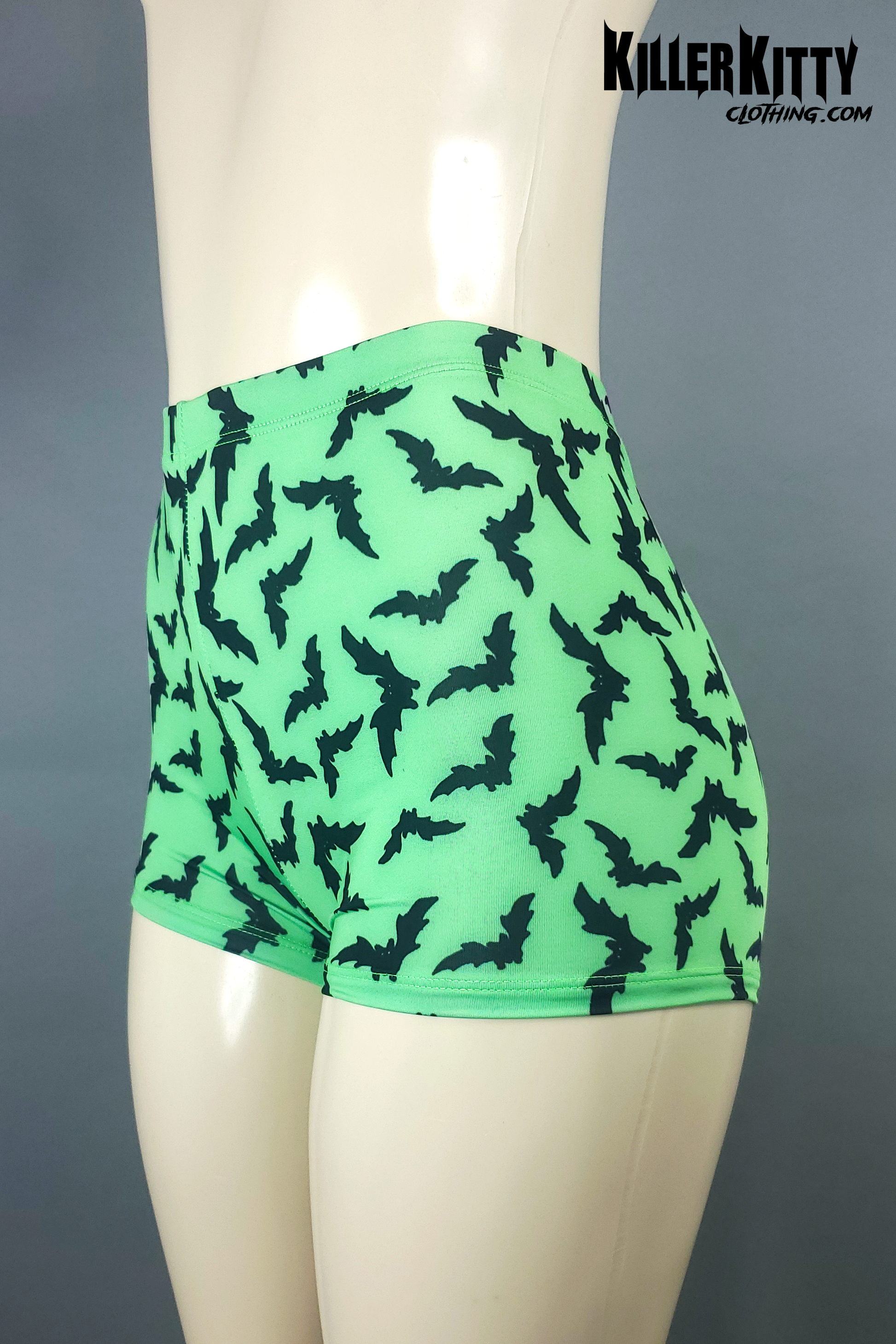 High waist neon green Bats booty shorts. Elastic waist and coverstitch on legs.