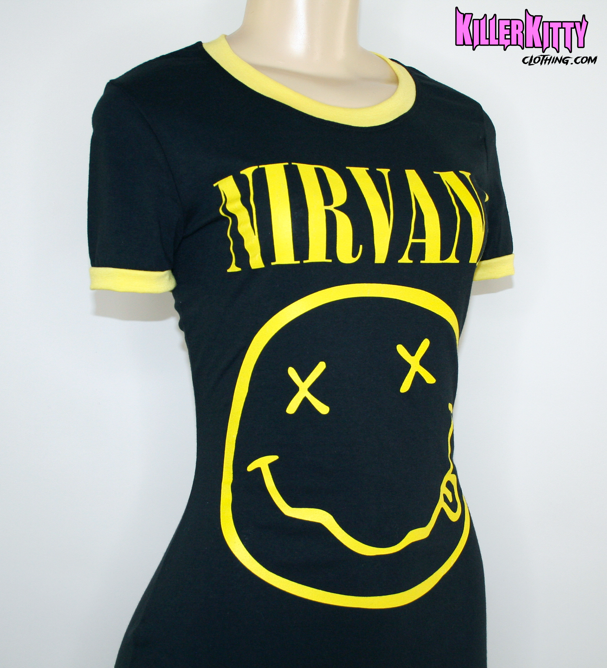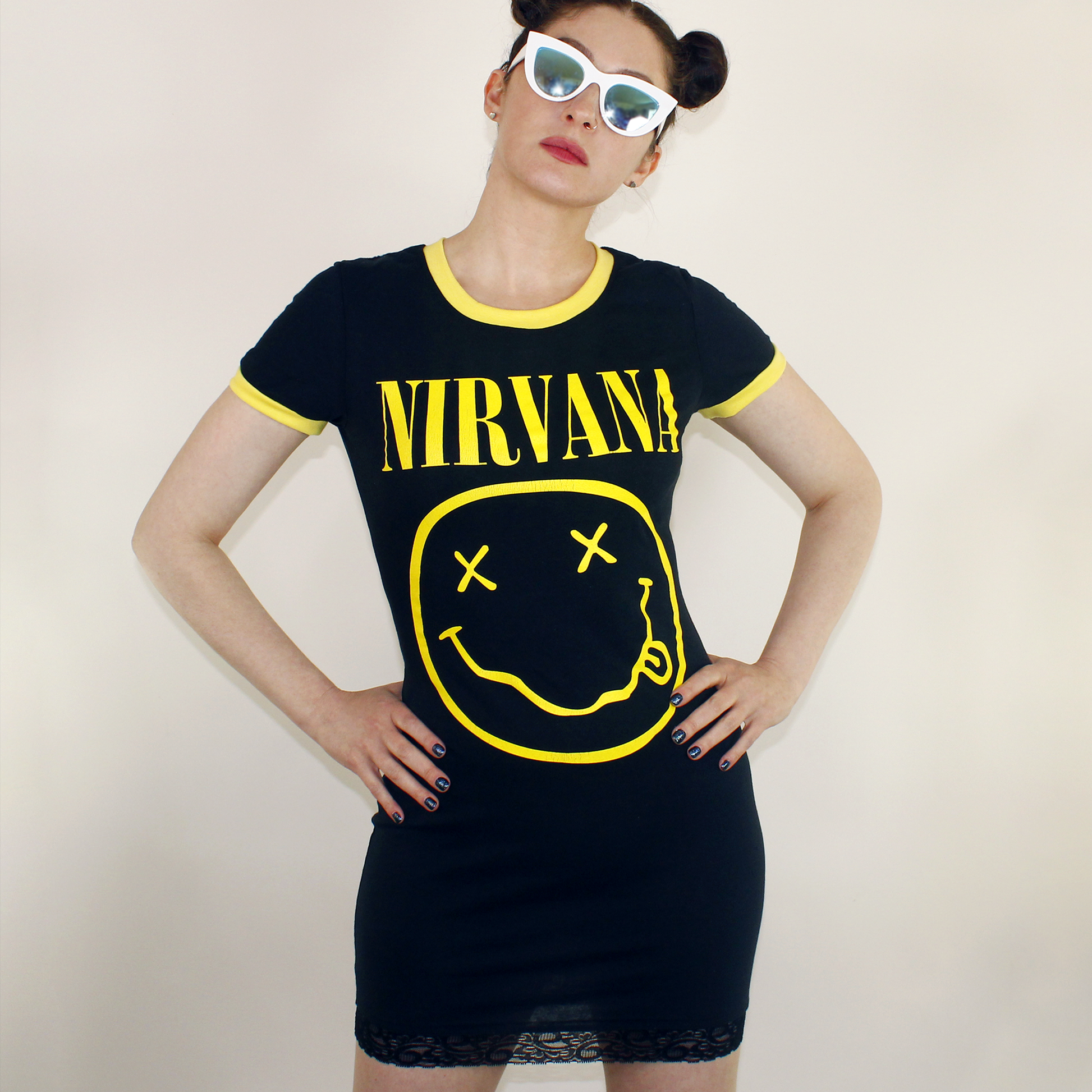 Altered from a t-shirt for a flattering fit with yellow knit trim on the neck and arms with black lace on the hem.