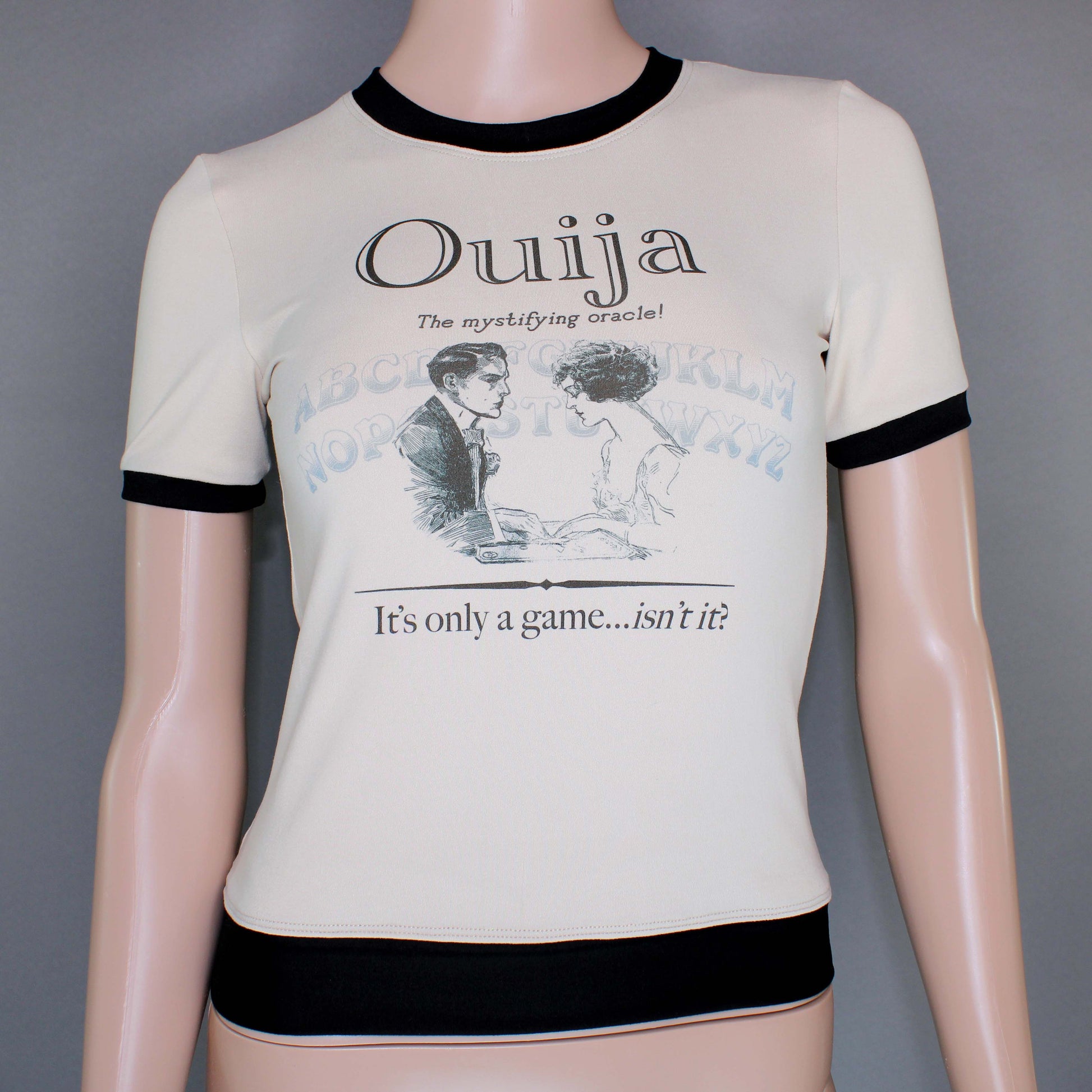 Ouija Board tan ringer shirt. Black trim on neck and arms.