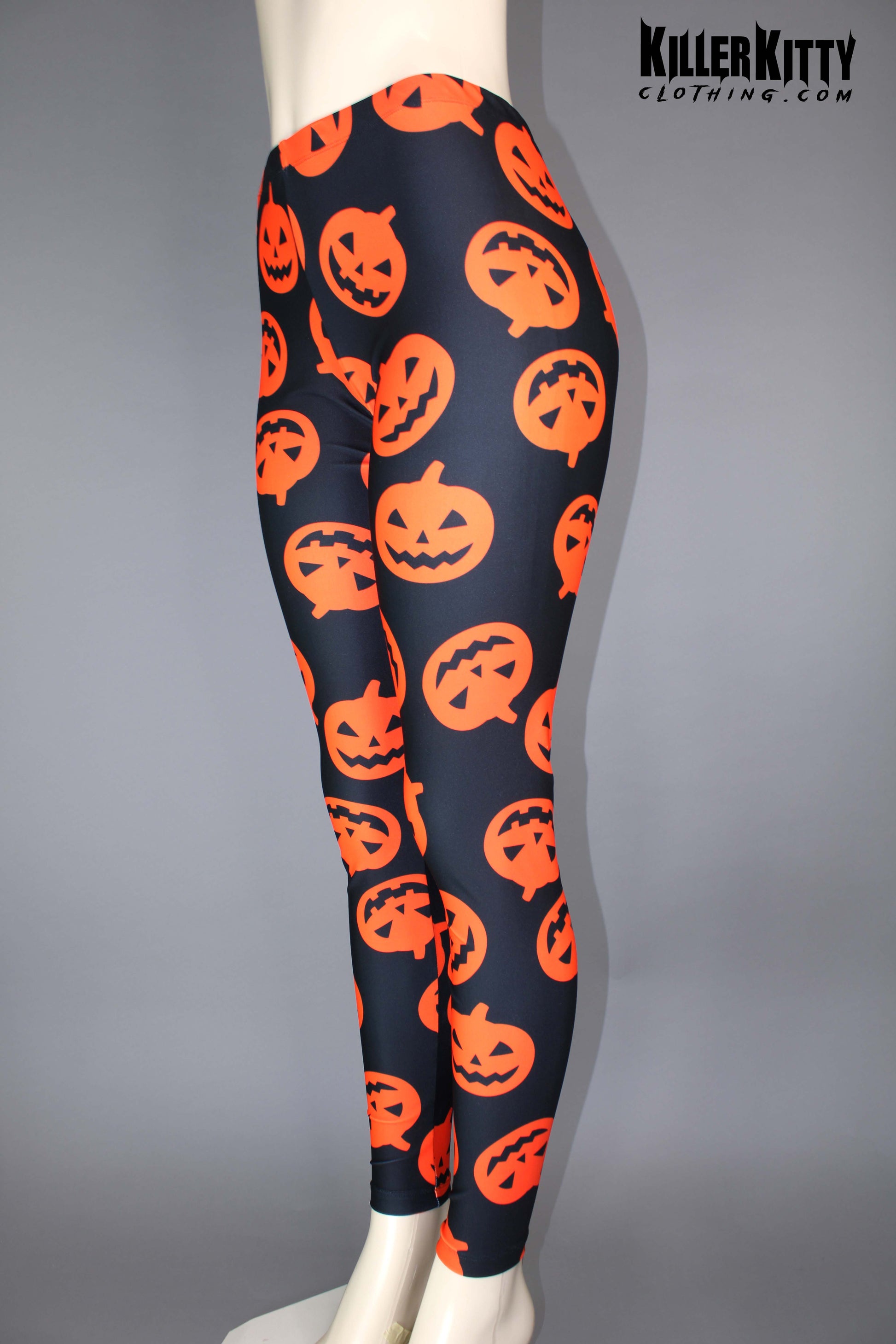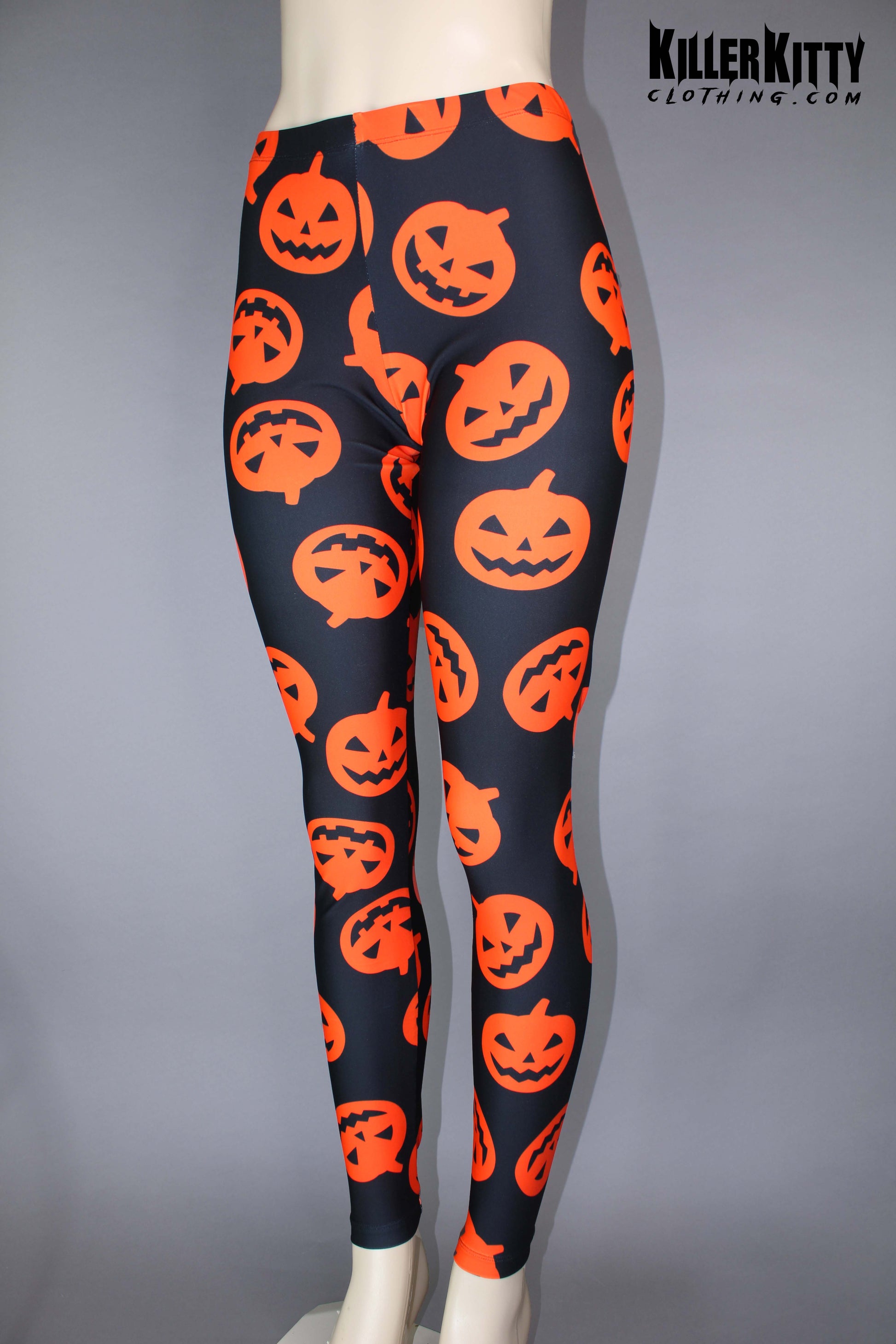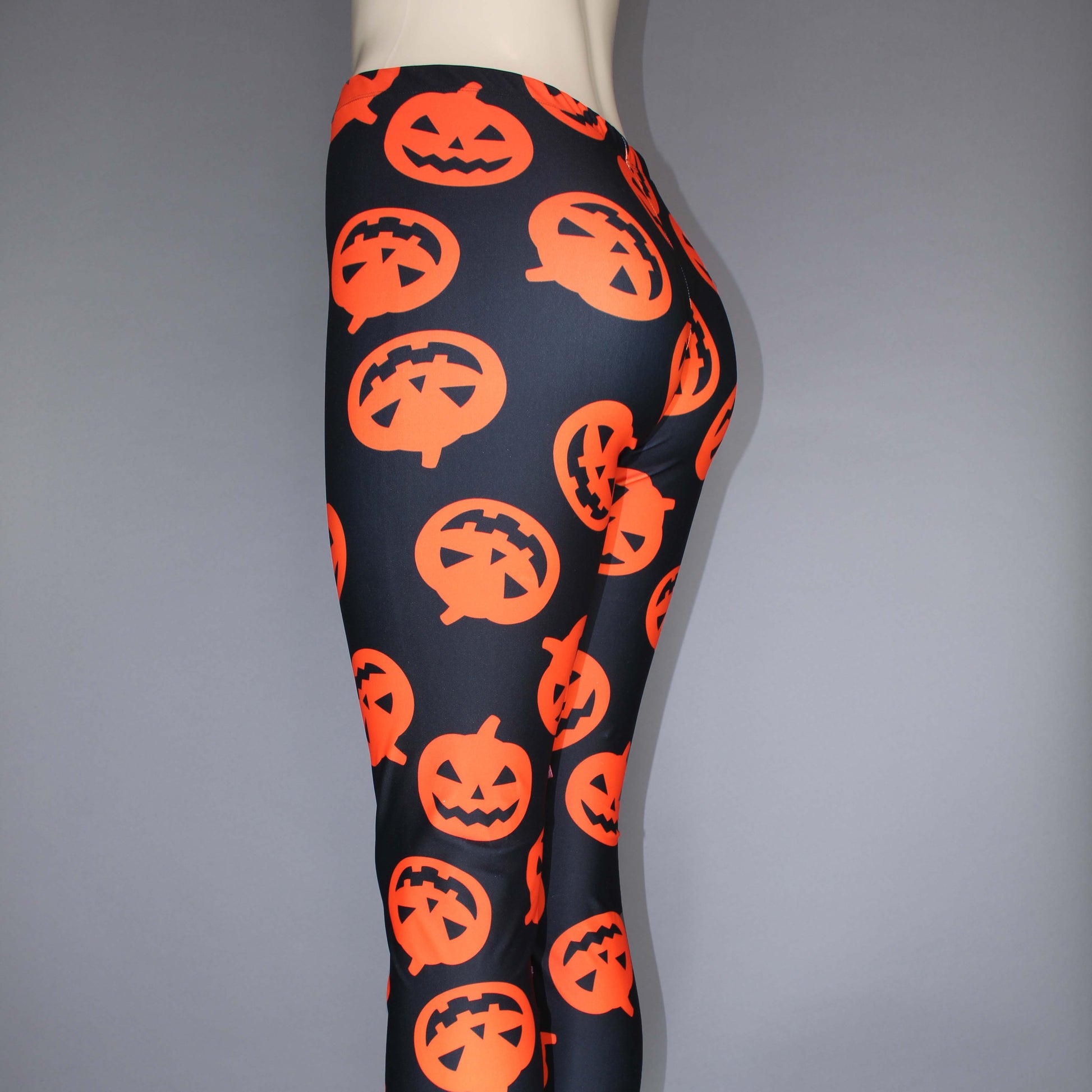 High waist spandex pumpkin leggings. Elastic waist and coverstitch on legs.