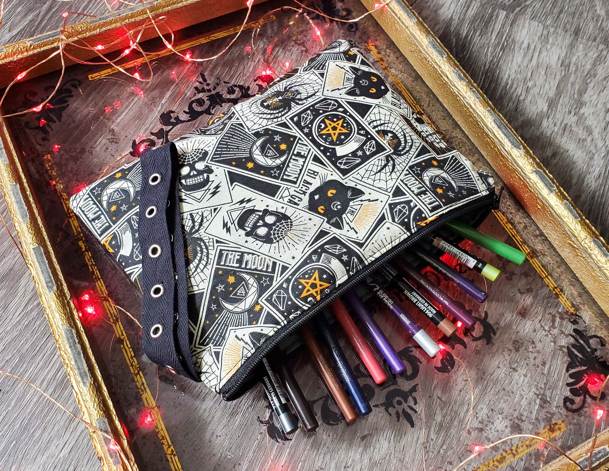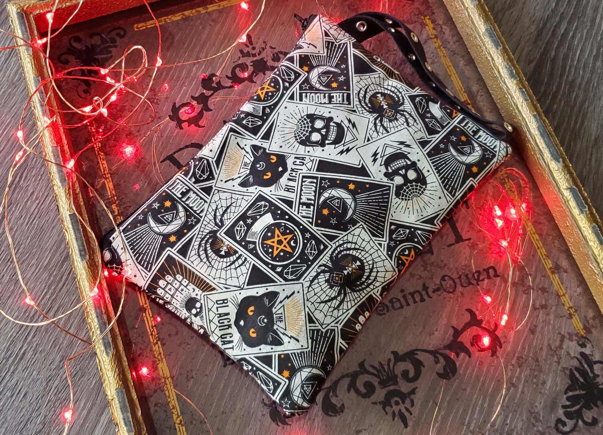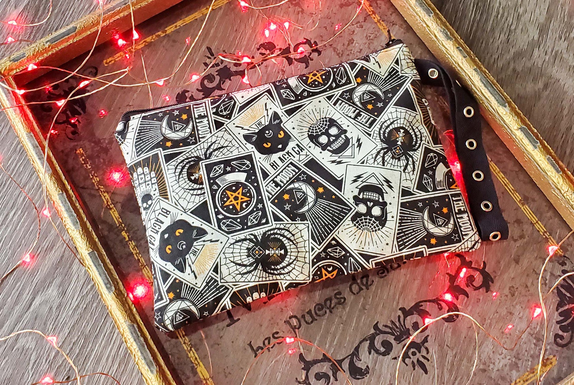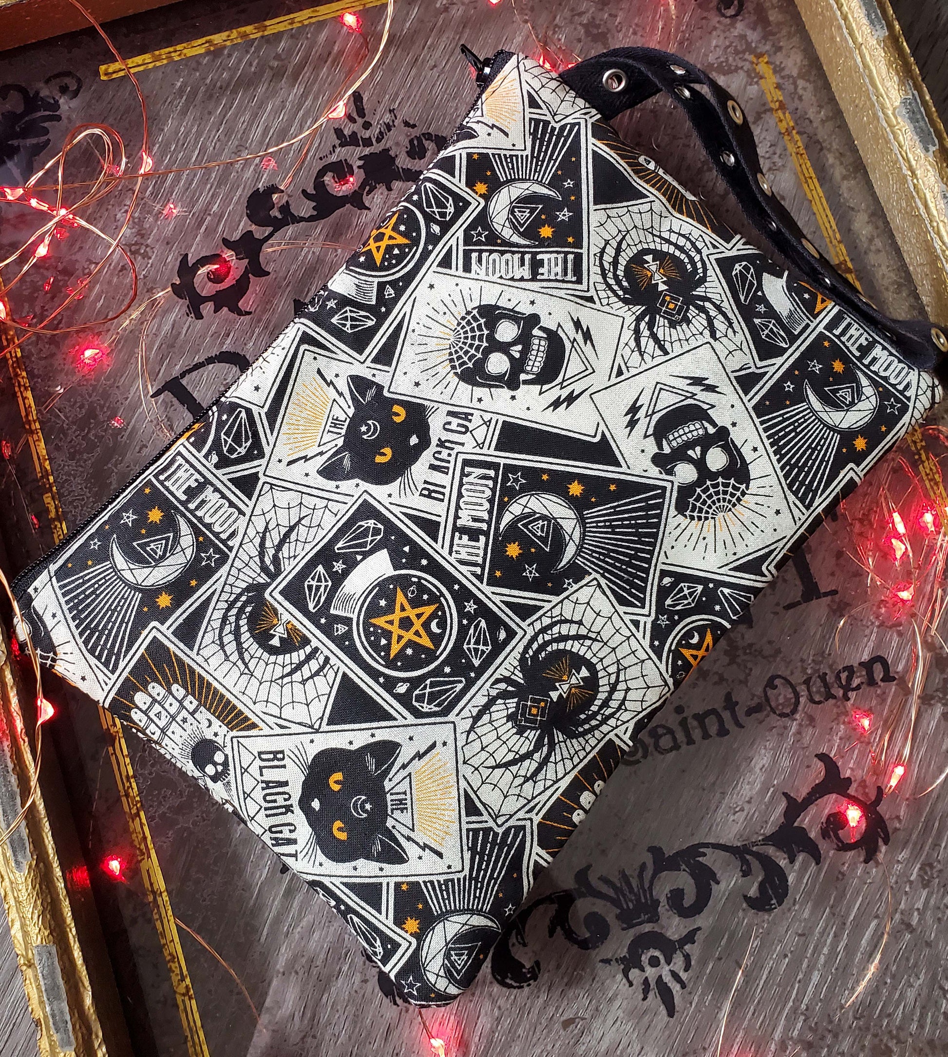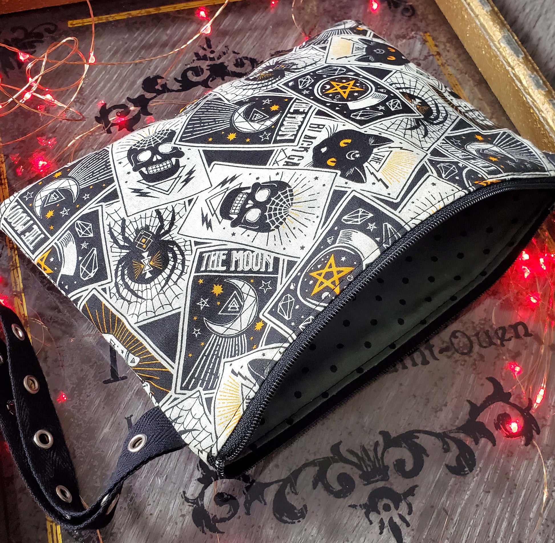 Handmade pouch / bag created using a tarot card cat print. The bag is lined in polka dot print with a zipper closure and grommet strap.