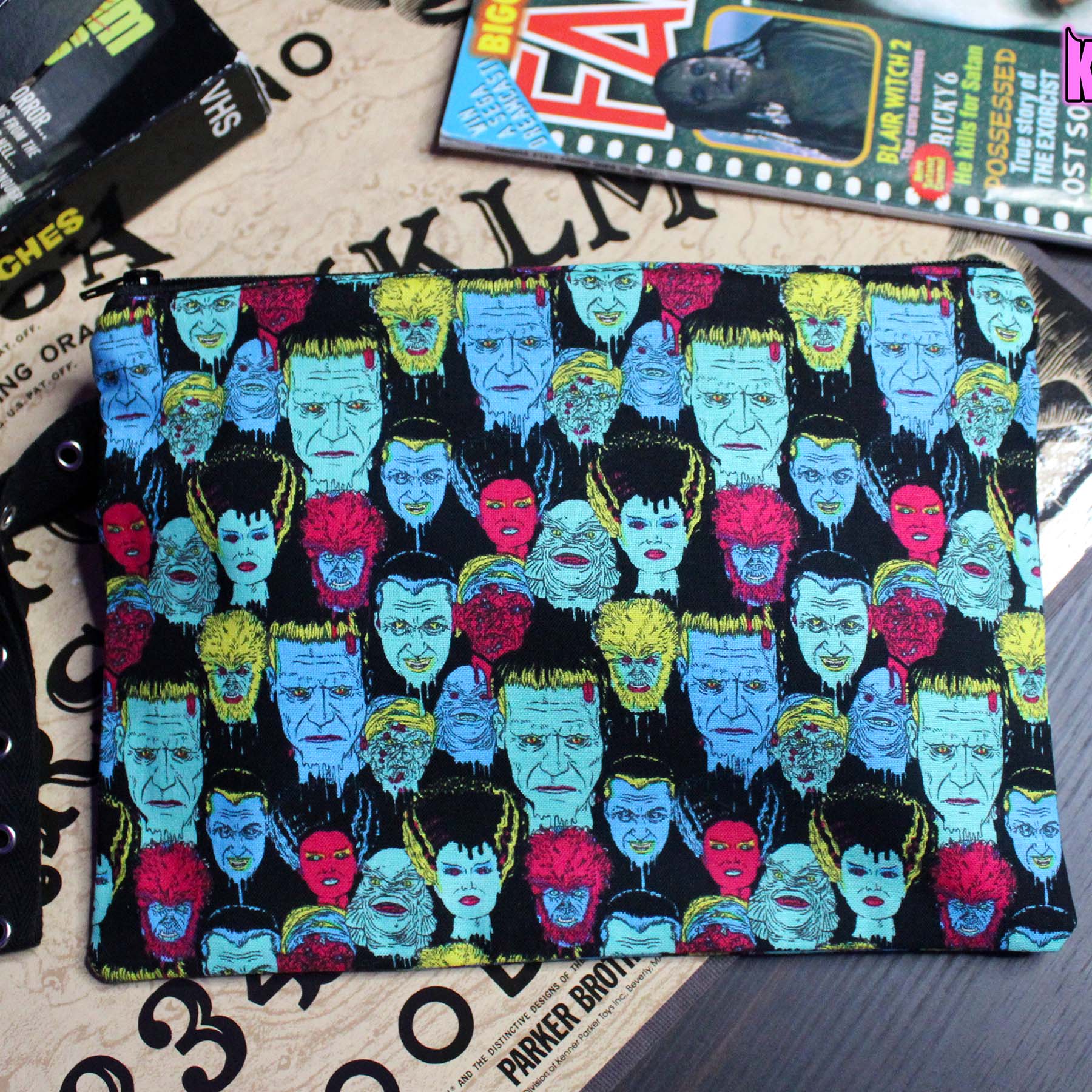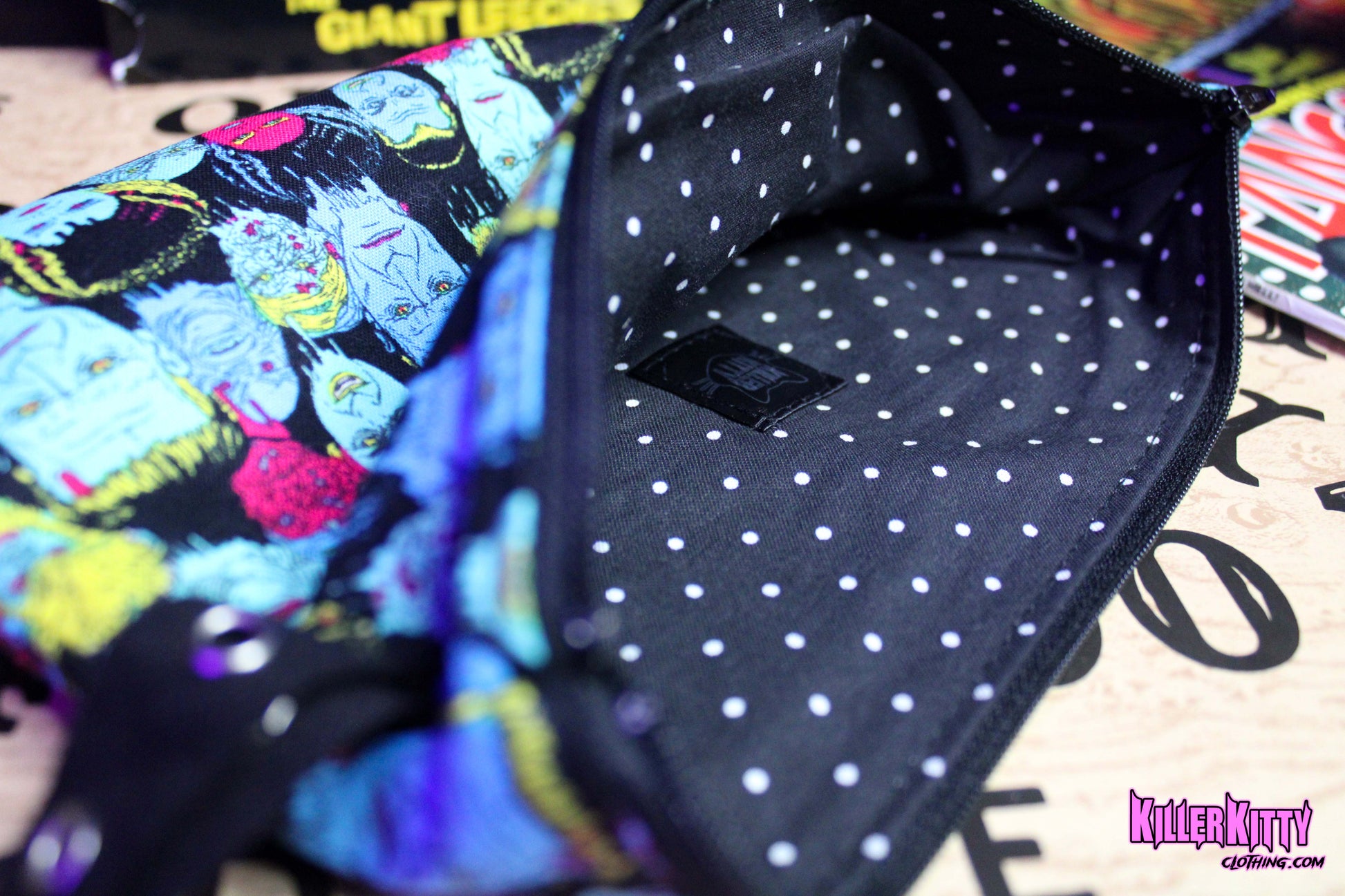 Handmade pouch / bag created using Universal Monsters print. The bag is lined in polka dot print with a zipper closure and grommet strap.