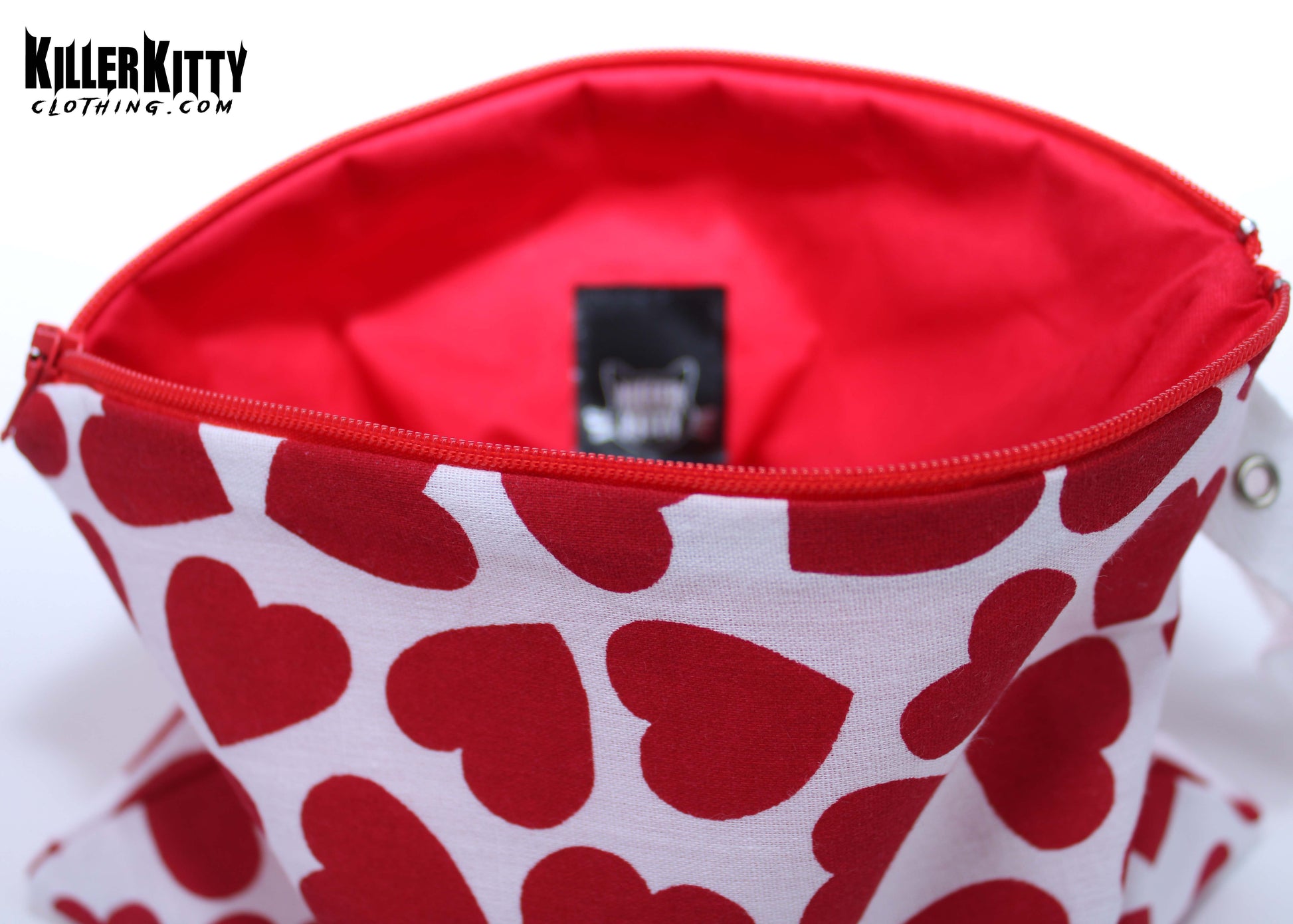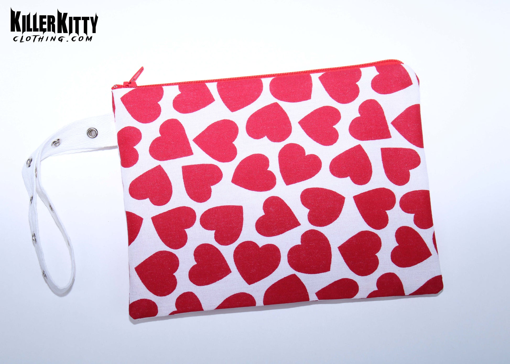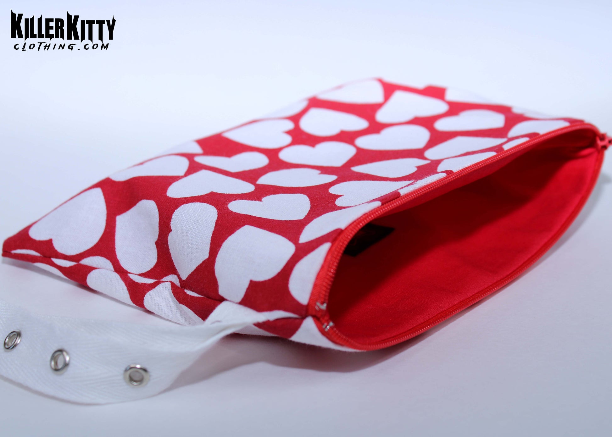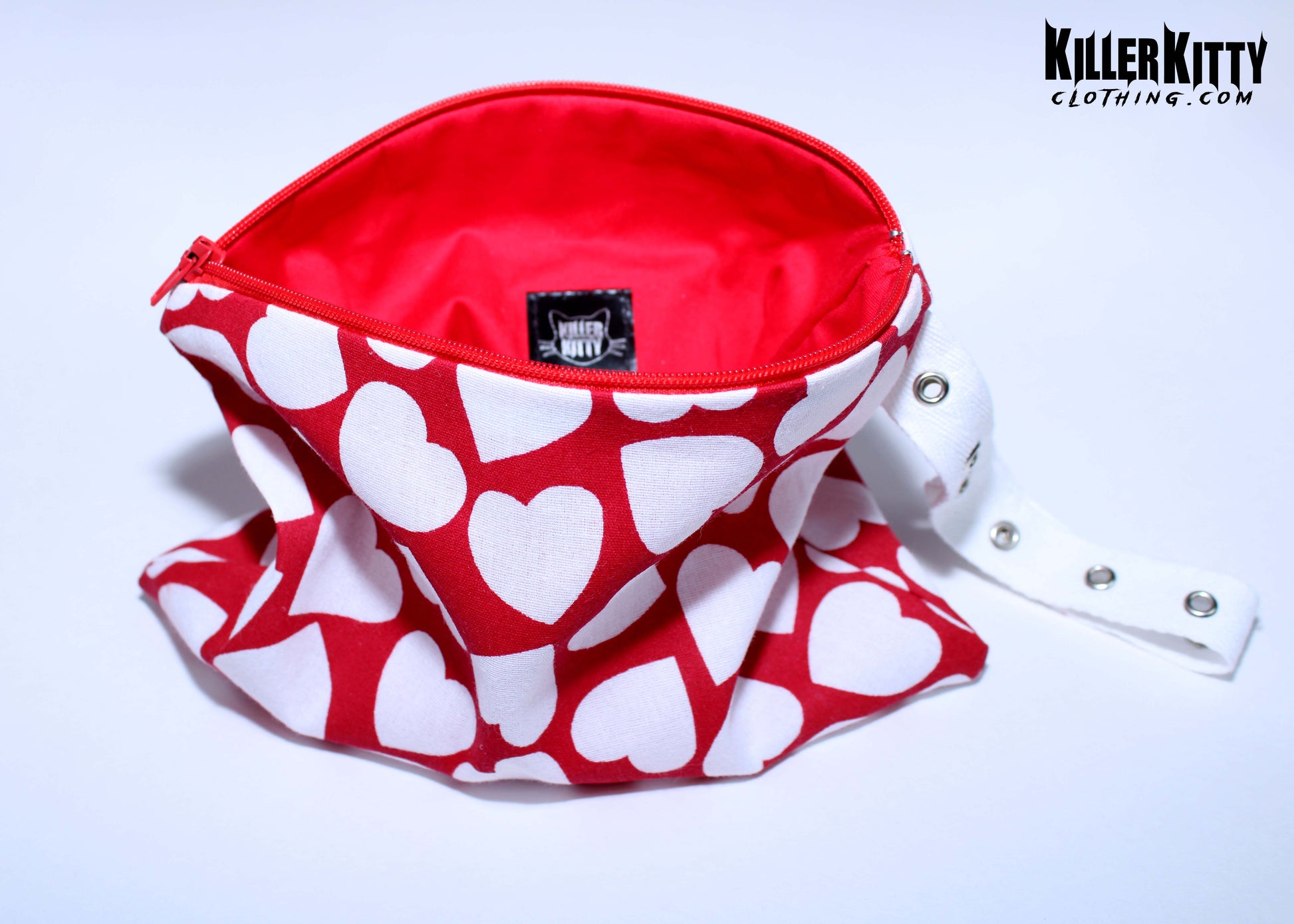Heart print pouch / bag created using vintage 90s material. The bag is lined in solid red with a zipper closure and grommet strap.