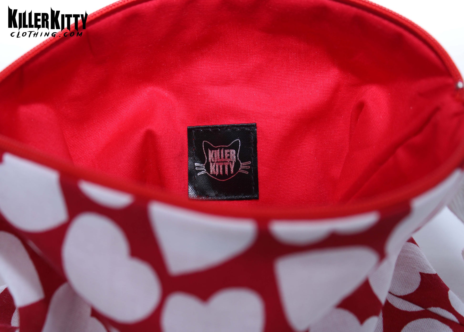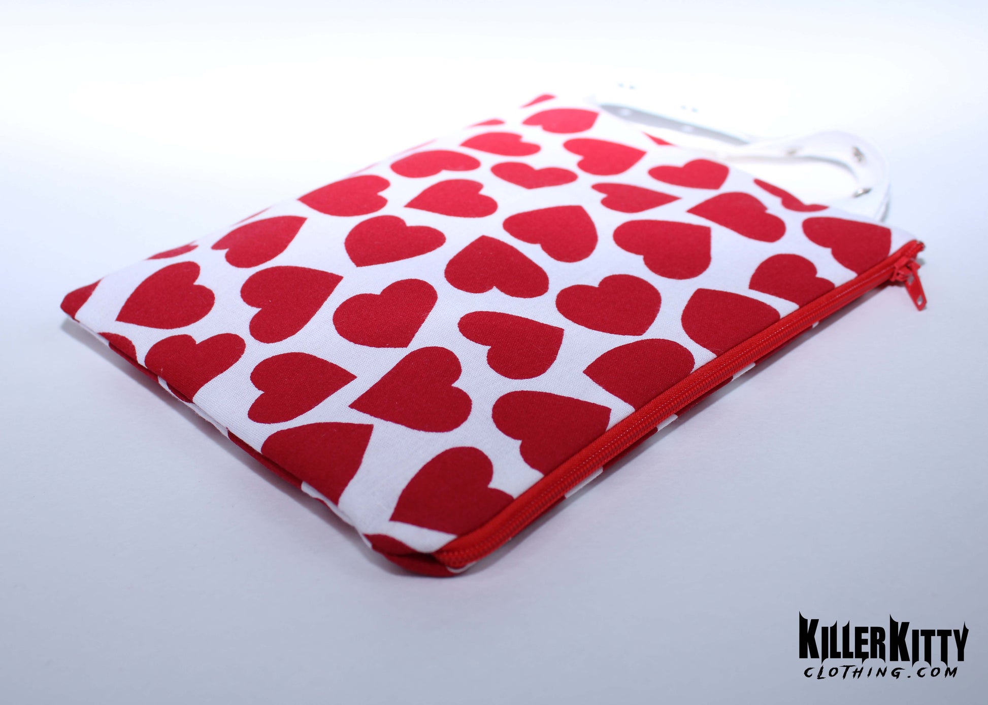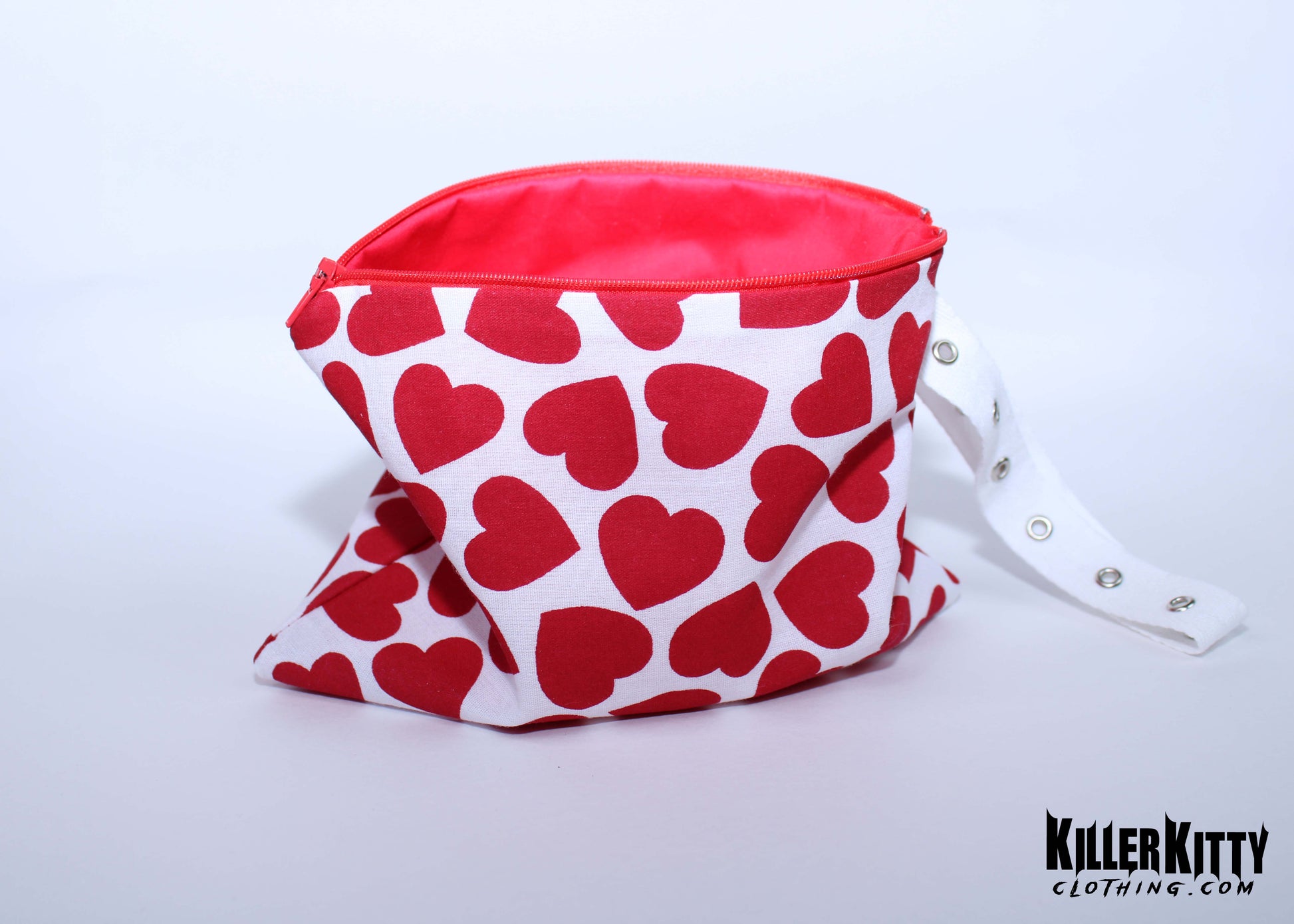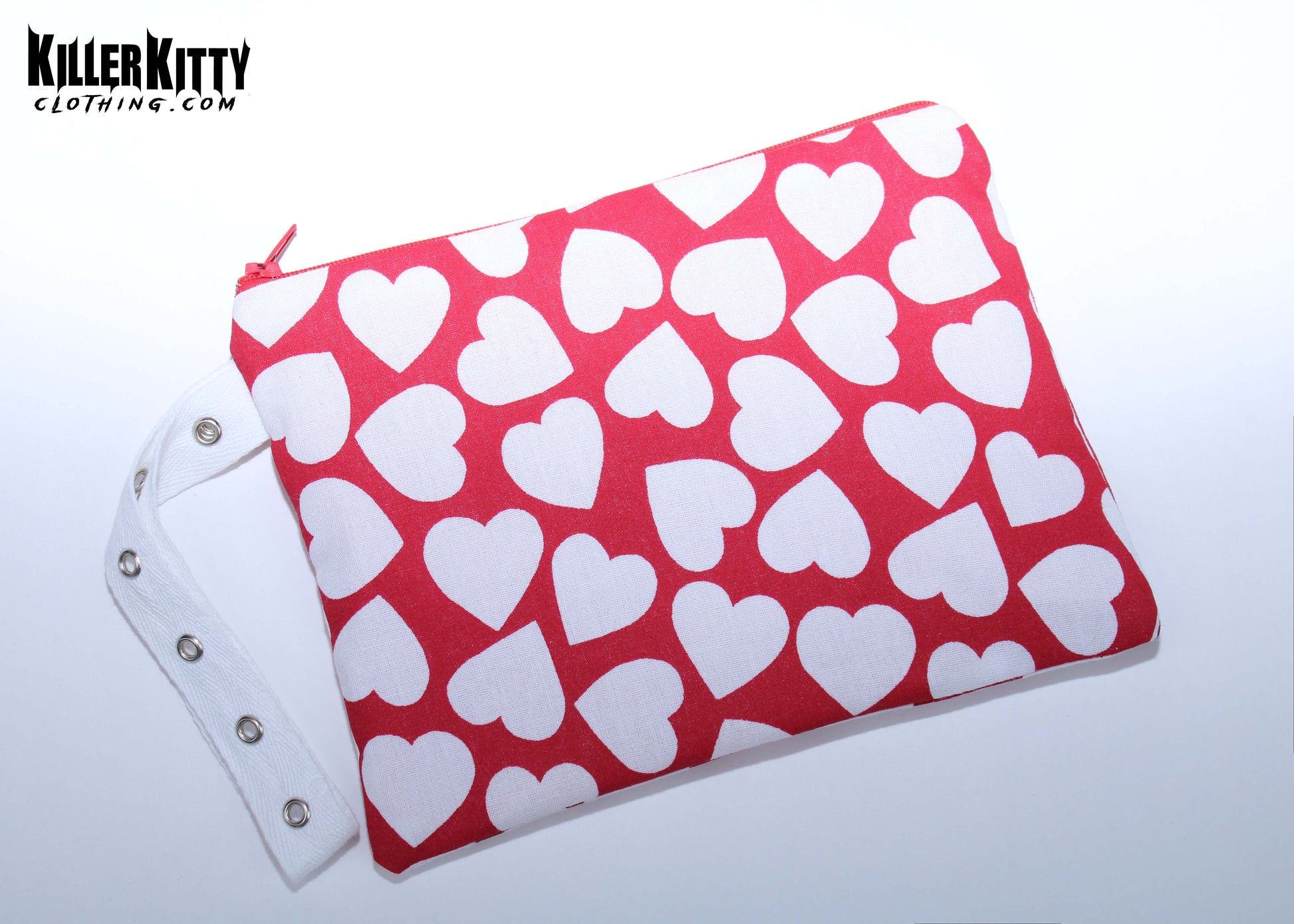 Heart print pouch / bag created using vintage 90s material. The bag is lined in solid red with a zipper closure and grommet strap.